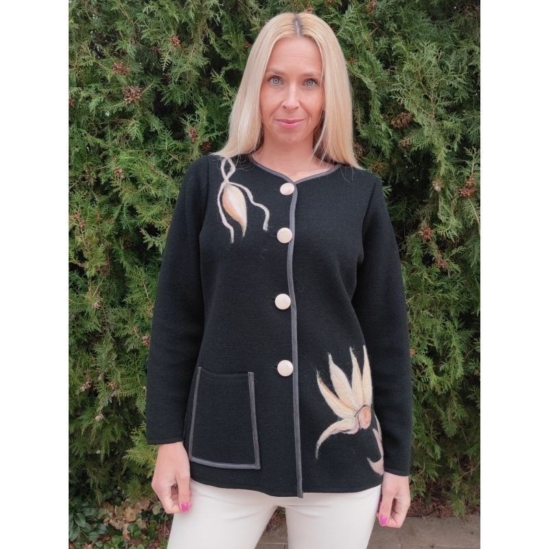 Elegant women's vest in black appliqué Available in sizes: M, L, XL, 2XL chest circumference: M size up to 100 cm, L size up to 106 cm, XL size up to 114 cm, 2XL size up to 124 cm Composition: 80% acrylic, 15% wool, 5% cotton Origin: Poland