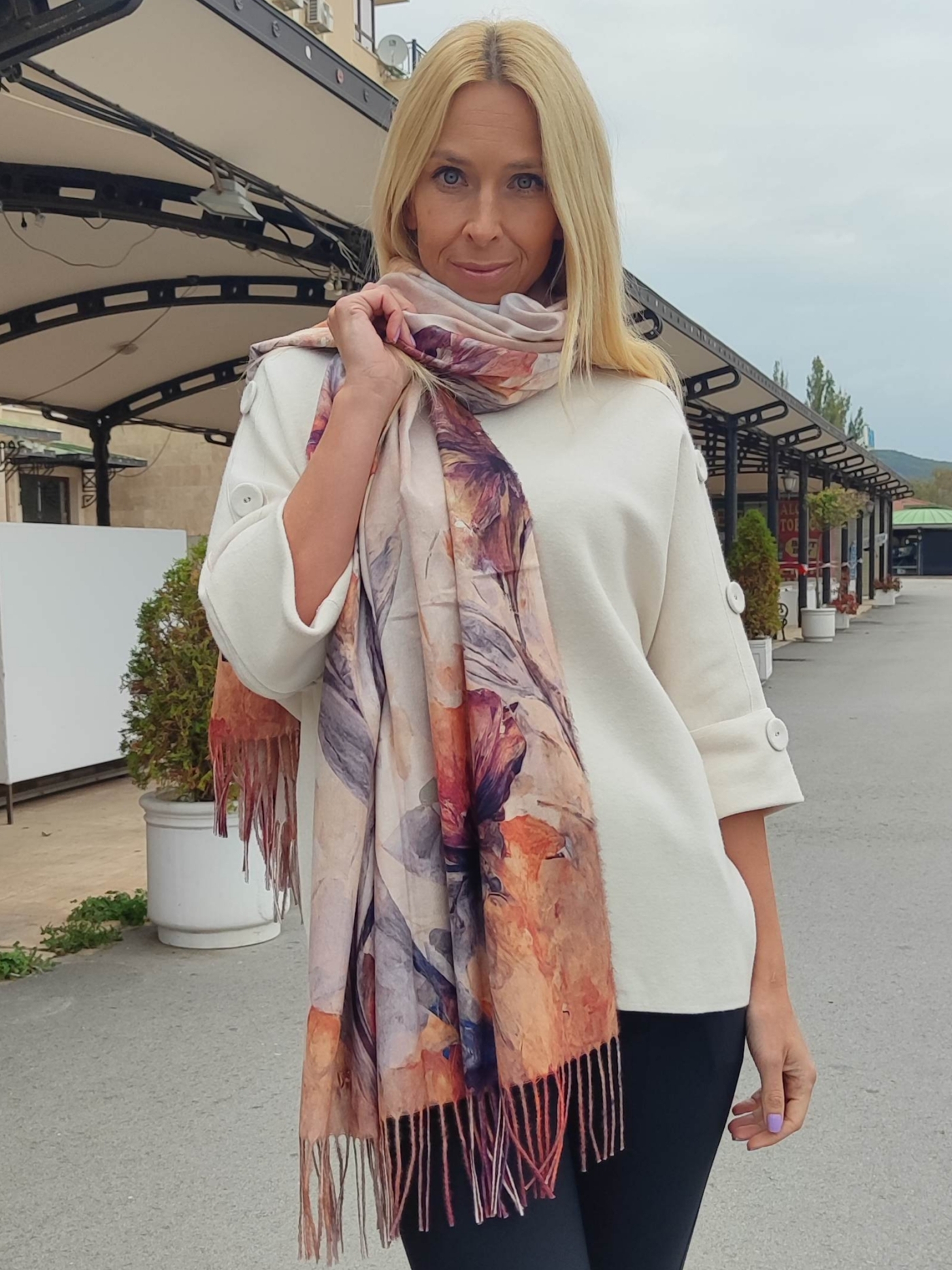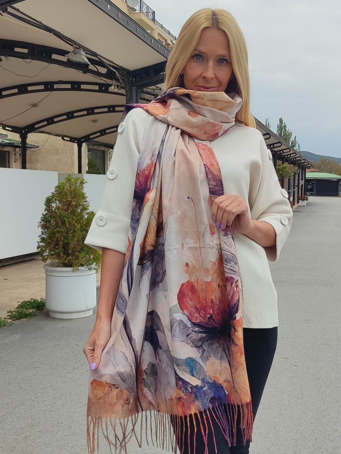 Add color and elegance to any look with this delicate scarf with watercolor flowers.