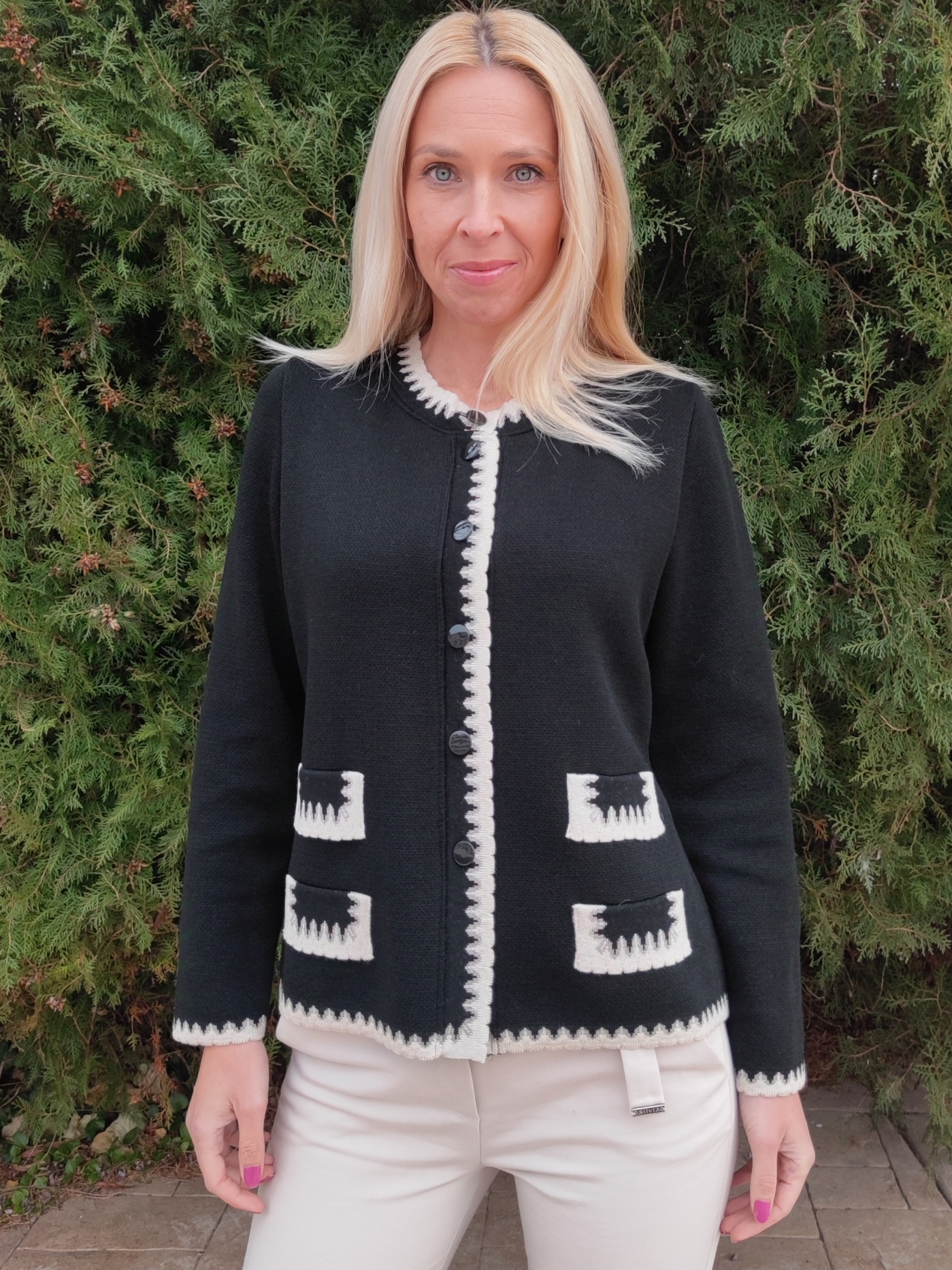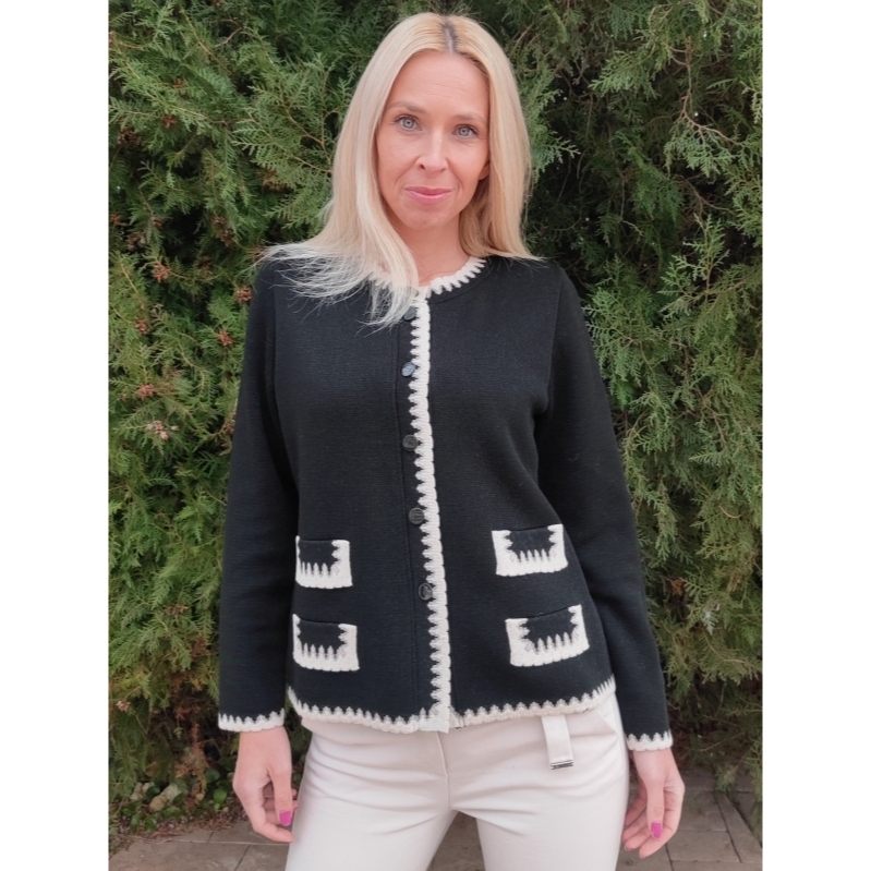 Black women's jacket type vest Available in sizes: M, L, XL, 2XL chest circumference: M size up to 100 cm, L size up to 106 cm, XL size up to 114 cm, 2XL size up to 124 cm Composition: 80% acrylic, 15% wool, 5% cotton Origin: Poland