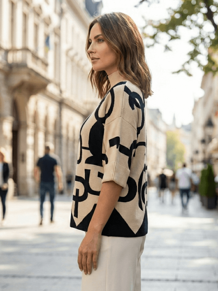 This elegant women's short-sleeved sweater is the perfect addition to your wardrobe. With its modern geometric print in the classic combination of black and beige, it can easily be combined with both trousers and skirts.
