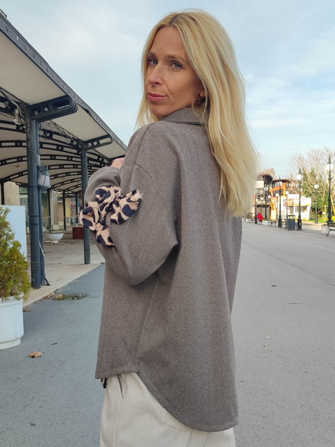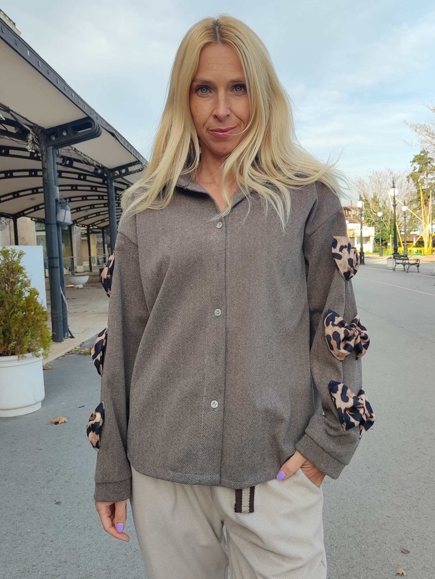 A stylish winter shirt with a unique character. Made of soft fabric with a fine herringbone pattern, it impresses with its elegant and modern look. The decorative ribbons with leopard print on the sleeves add a touch of originality and feminine charm.
