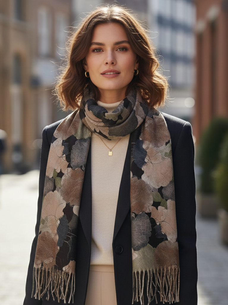 p>Add style and warmth to your fall-winter wardrobe with this elegant women's scarf with a leaf print. The combination of earthy colors - beige, green ,gray, black and gold - makes it easy to combine with any coat or jacket.