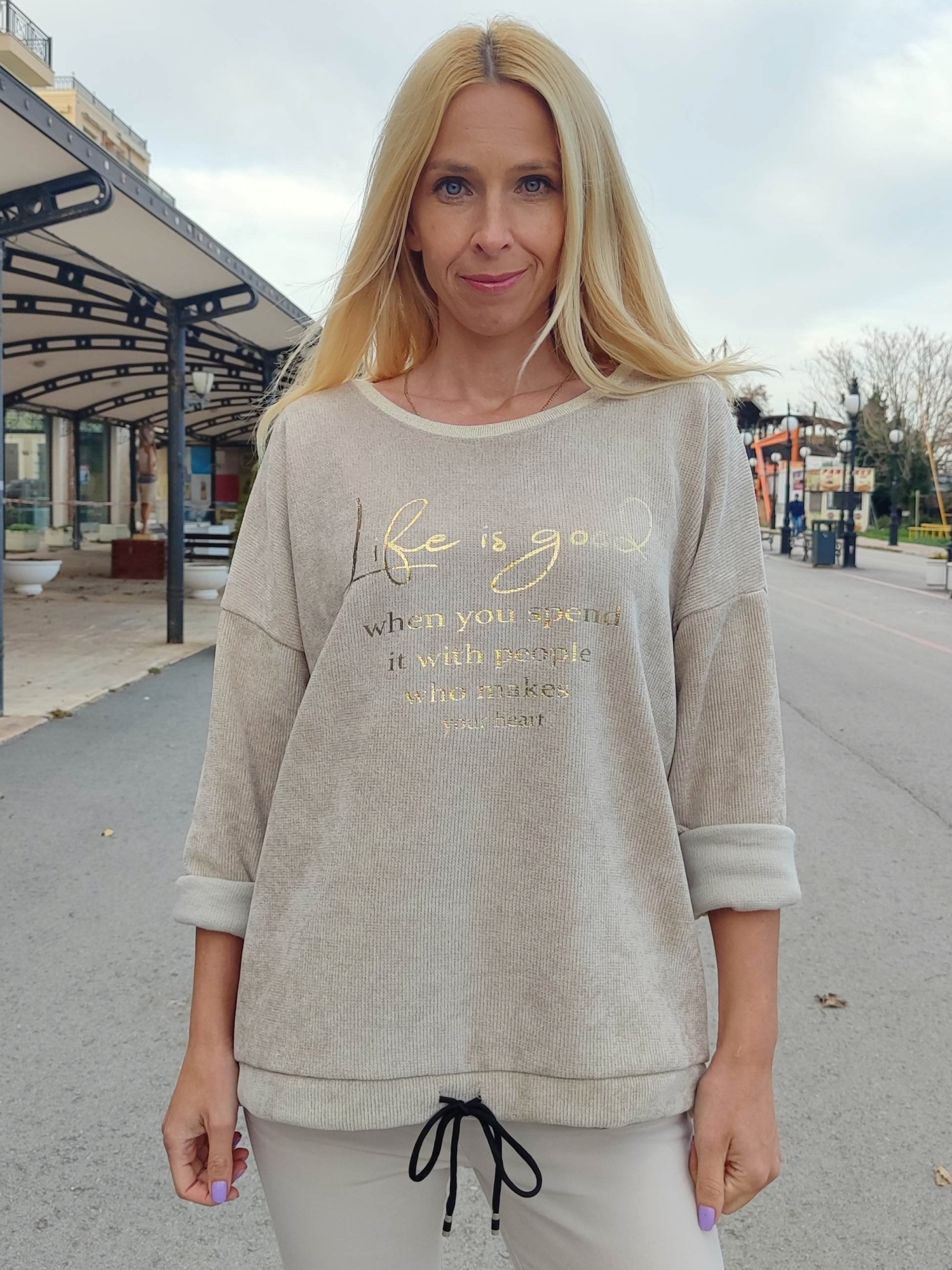 Women's beige blouse with inspiring golden inscription "Life is Good" – Sporty-elegant style