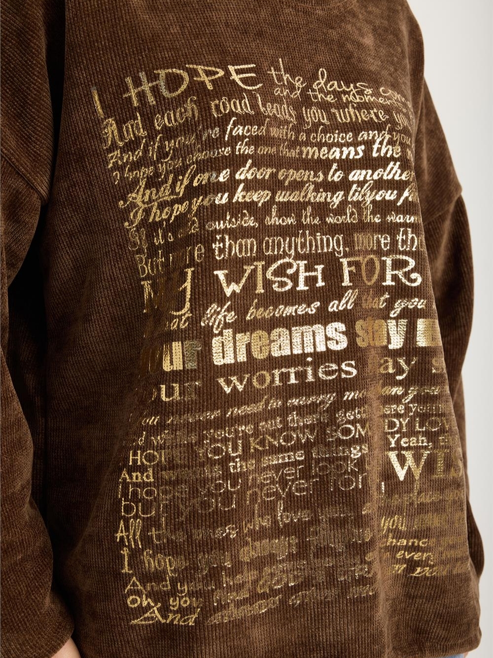 ⭐ Cozy brown blouse with a soft ribbed texture and an inspiring gold inscription "My Wish For".