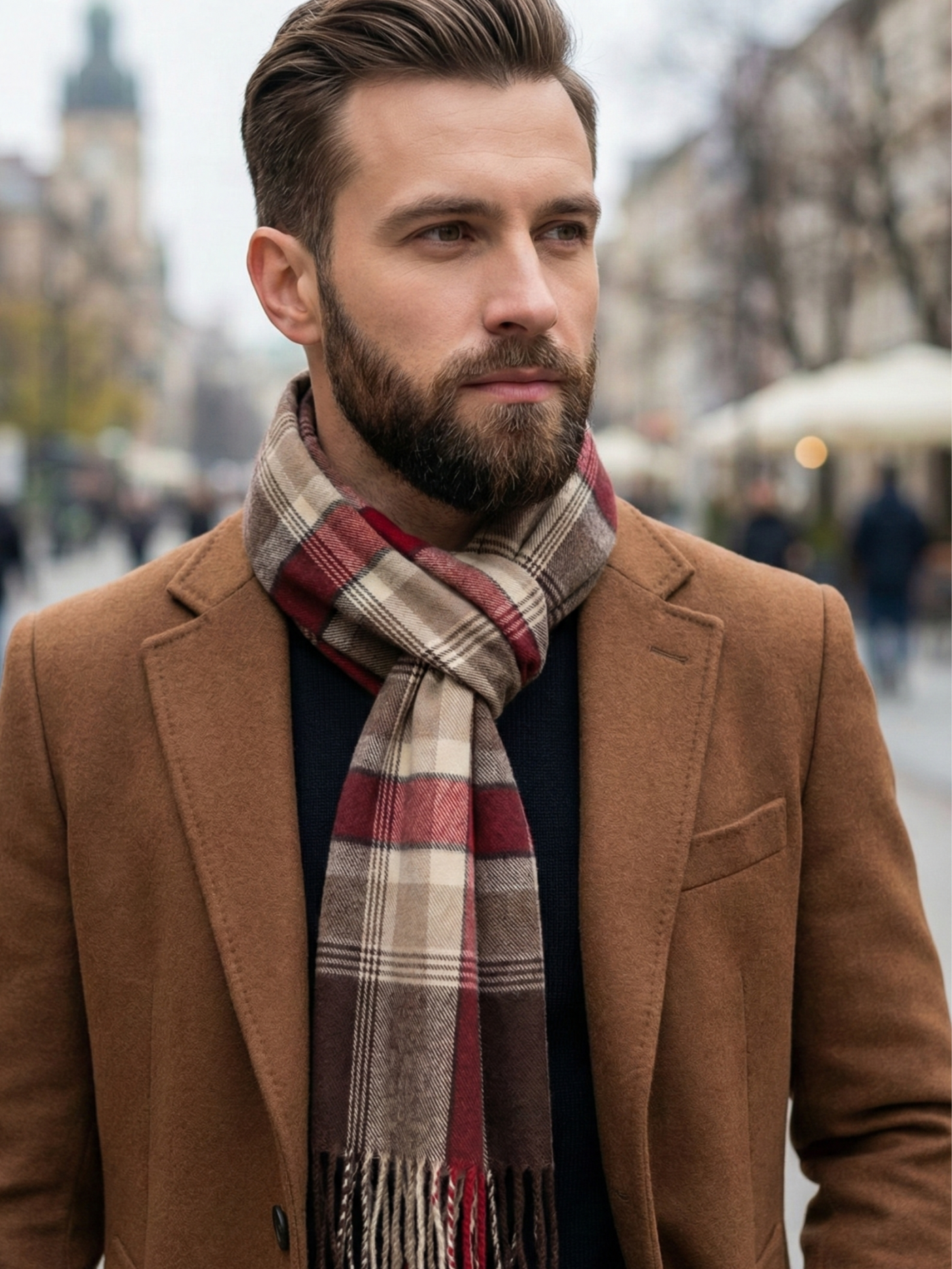 Luxurious Men's Checkered Scarf – Soft Cashmere in Beige, Brown and Burgundy