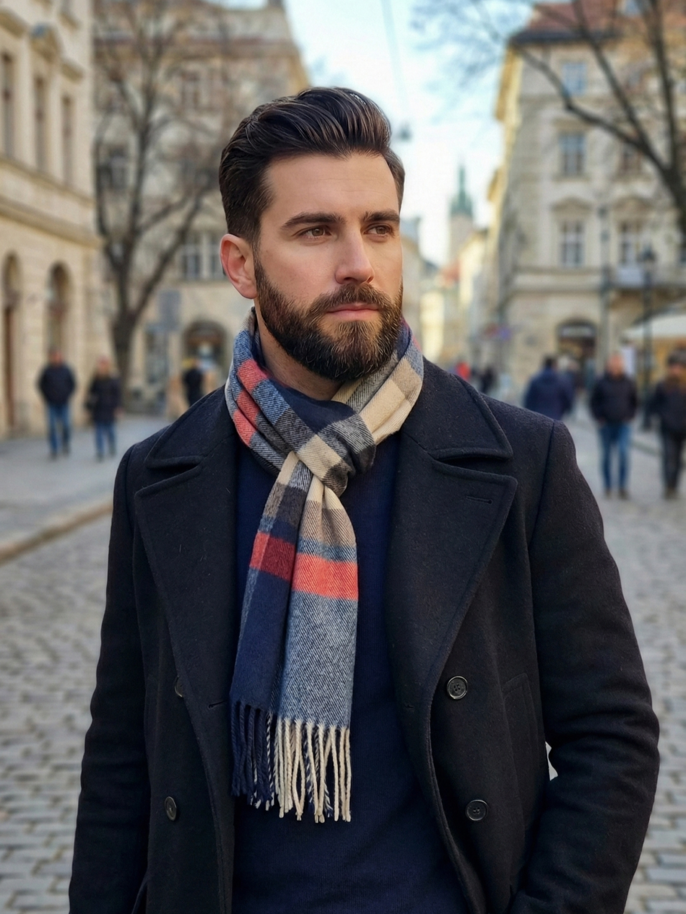 Add a touch of British elegance to your winter wardrobe with this luxurious men's scarf in a classic check pattern. This model is a symbol of timeless style and is a must-have accessory for the modern gentleman.