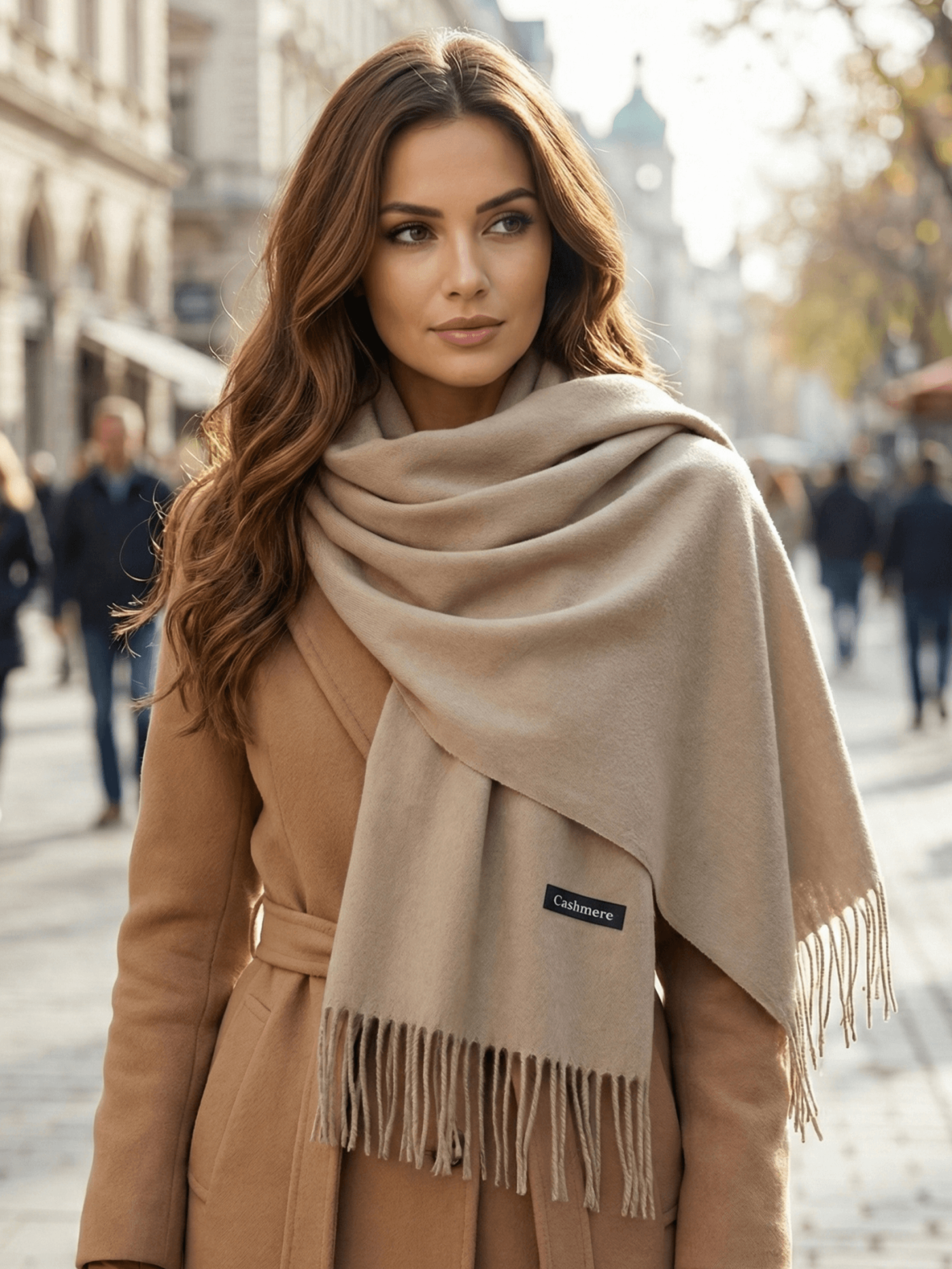 Luxurious, beige cashmere scarf. Provides unparalleled warmth and softness.