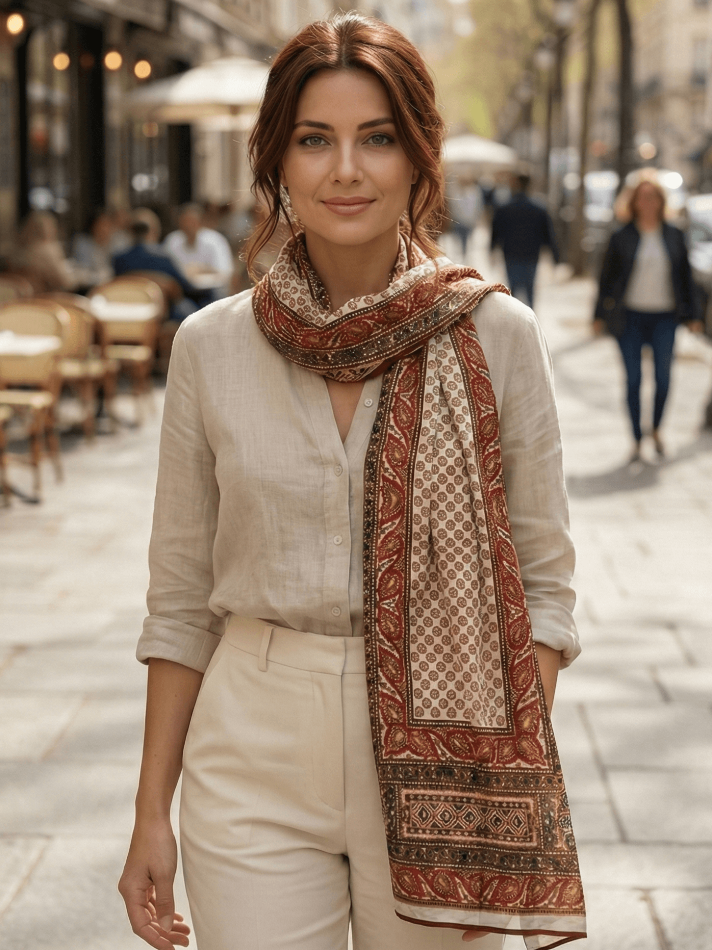 Luxurious Viscose Satin Scarf with Ethnic Motifs (95x190 cm) – Bordeaux and Ecru