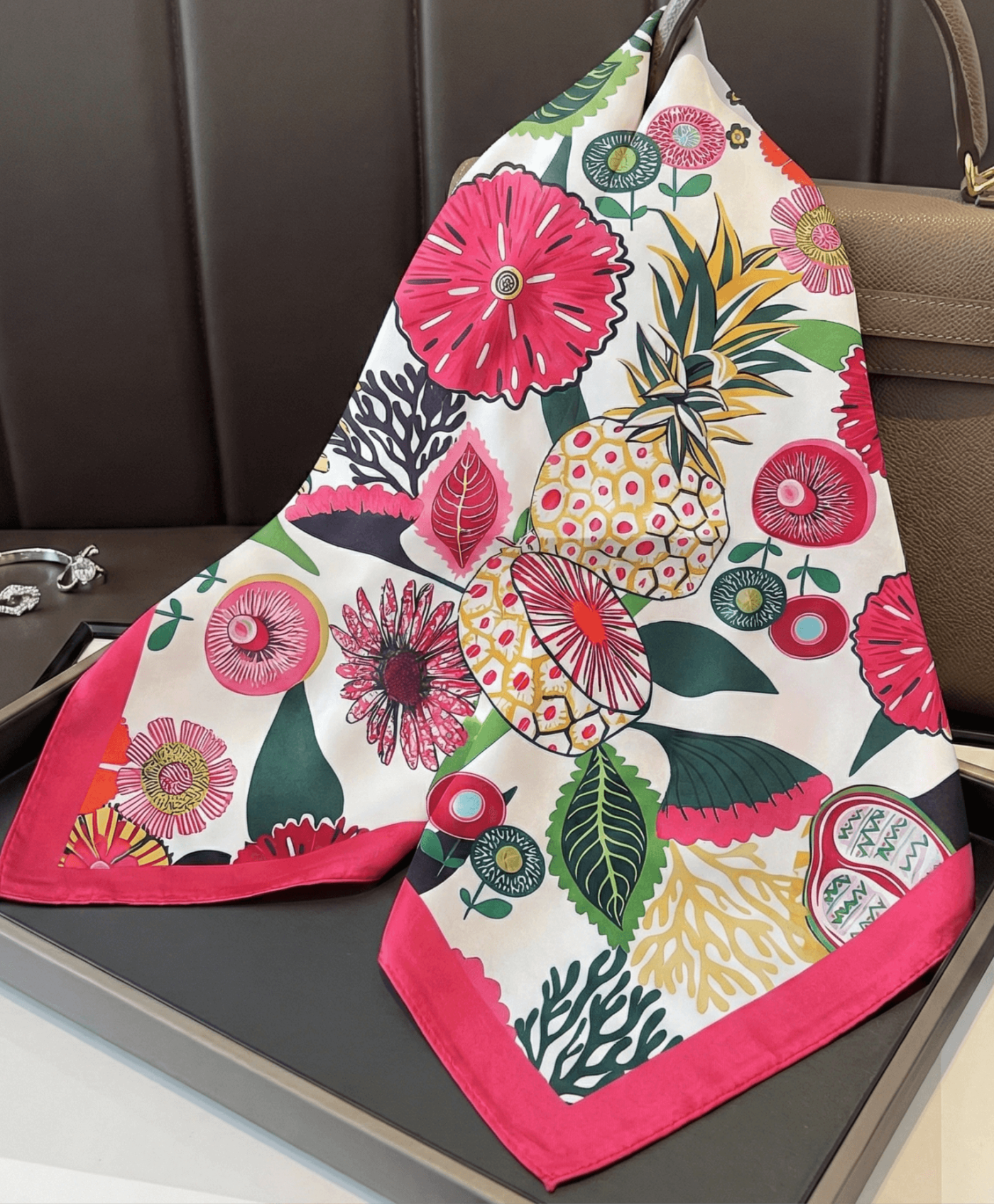 Fresh women's scarf-towel (70x70cm) with a bright tropical print, pineapples and flowers.
