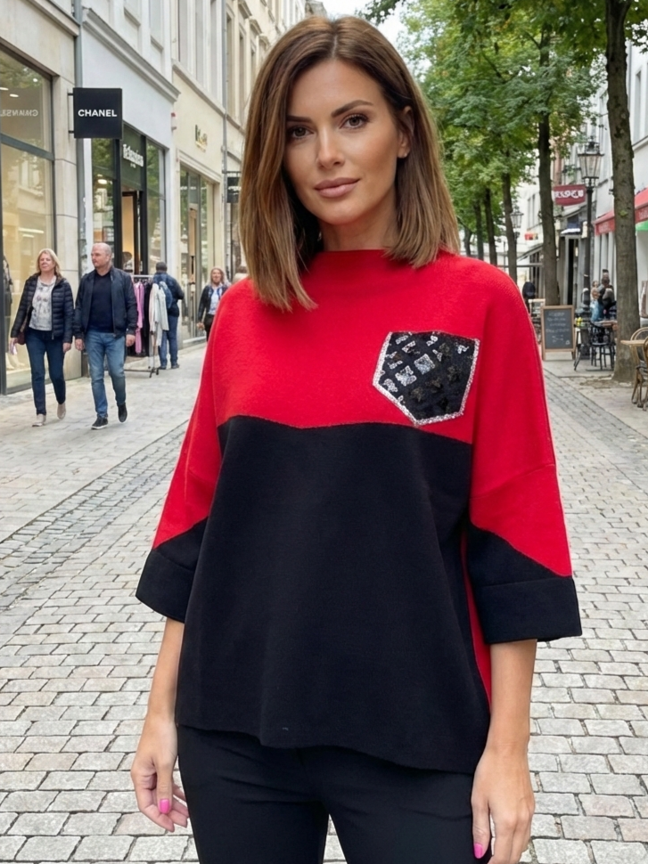 The spectacular "color block" design combines classic black and bright red, and the accent falls on the stylish decorative pocket, trimmed with shiny sequins. The fabric is extremely soft, elastic and pleasant to the touch, thanks to the high content of viscose.