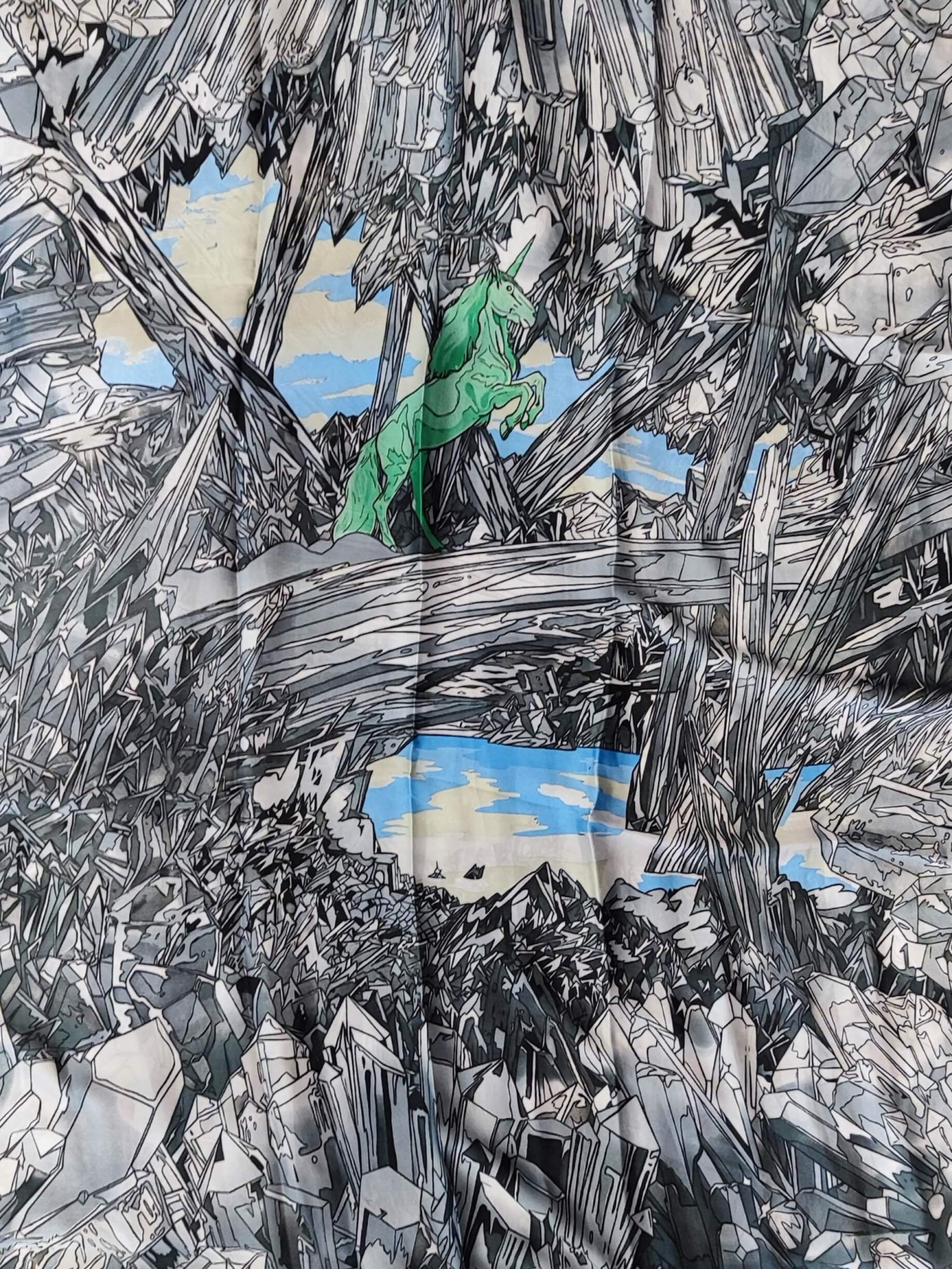 Unique art design with a green unicorn among grey crystals.