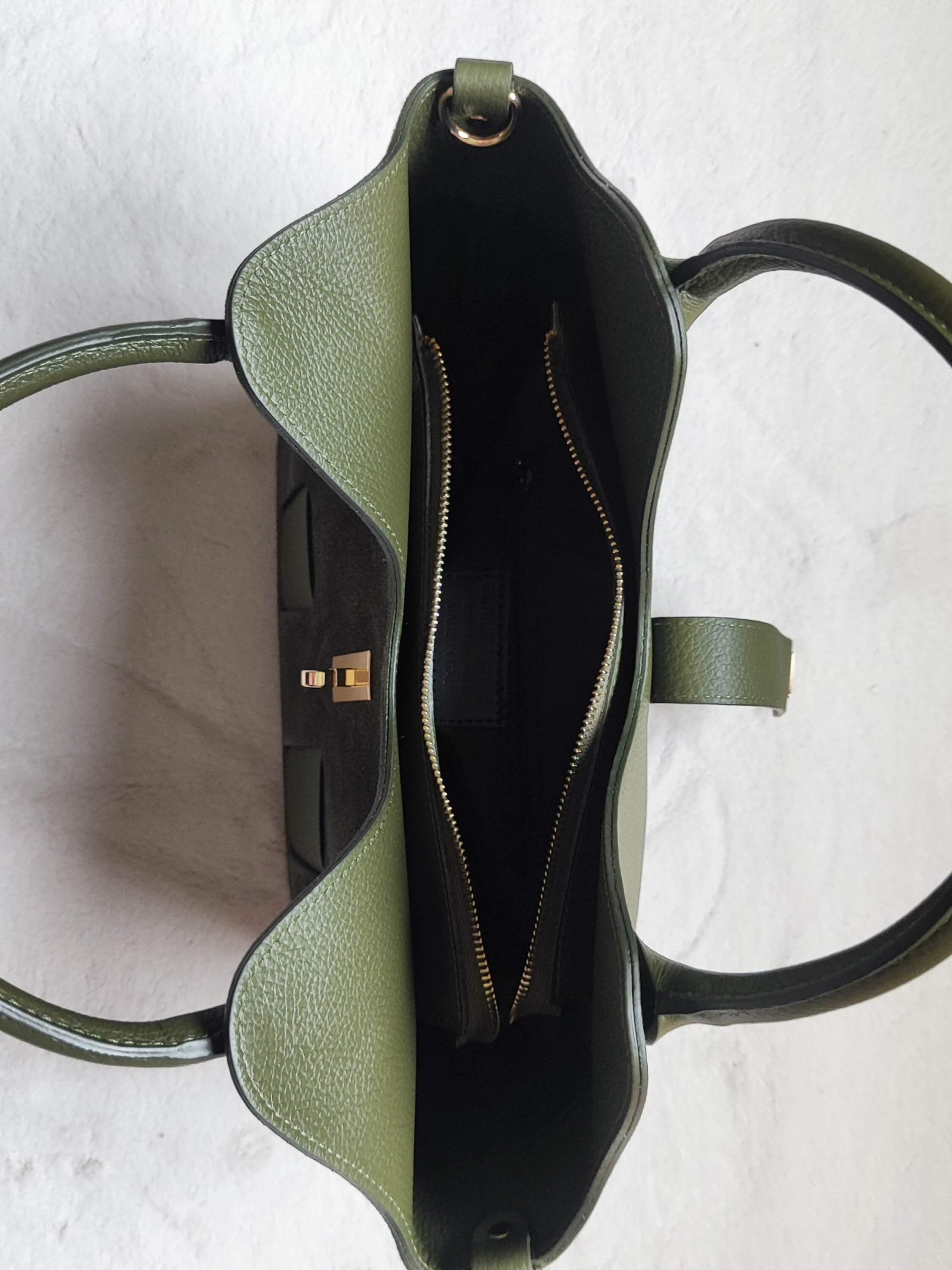 Materials: High-quality suede (face) and smooth genuine leather (Vera Pelle) (back and handles).