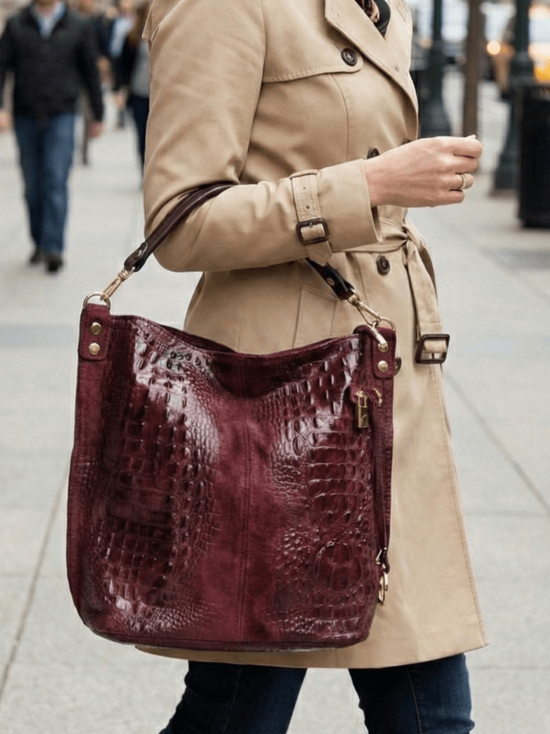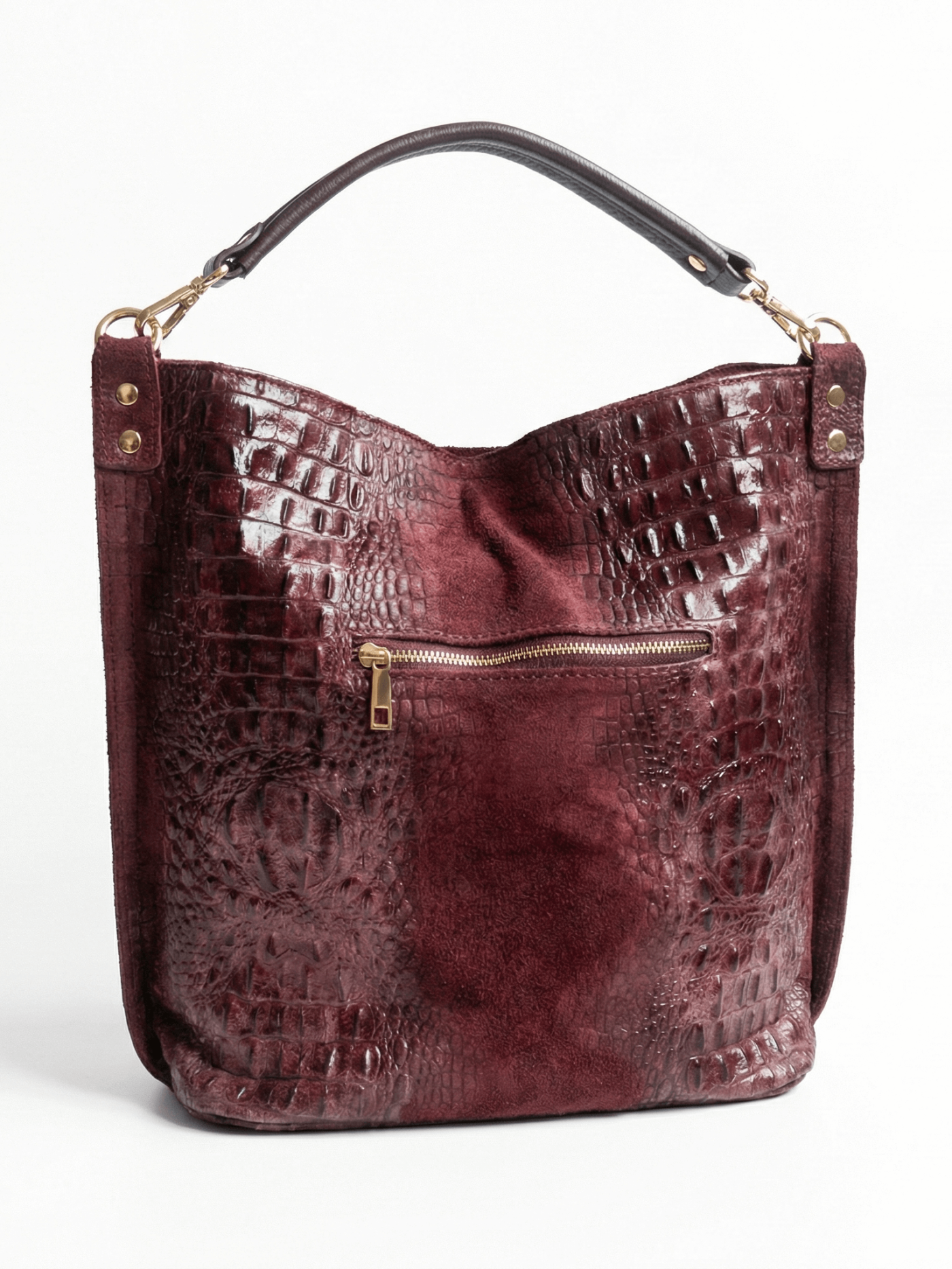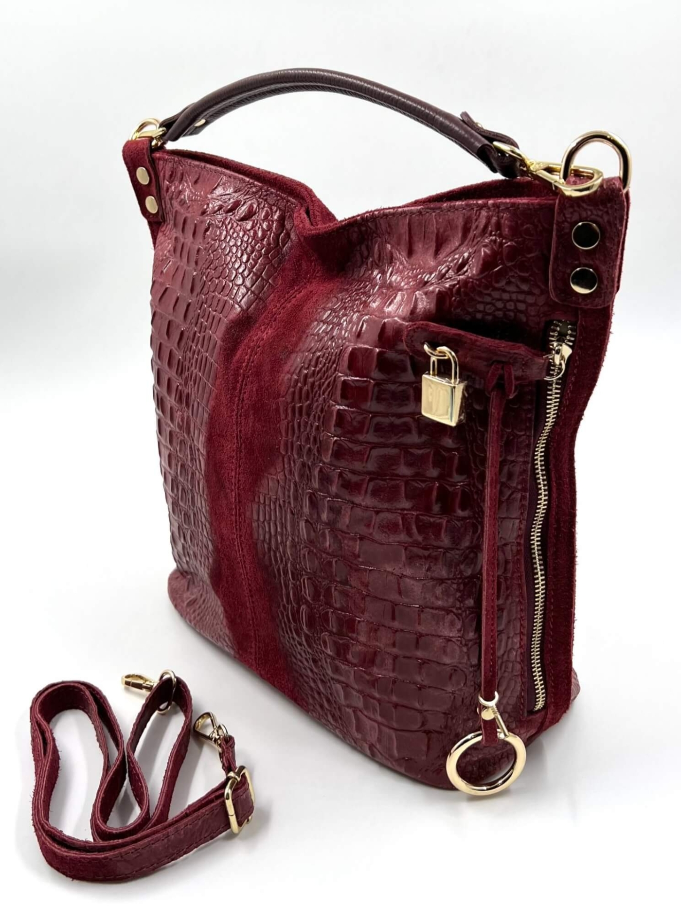Add a touch of Italian luxury to your look with this exquisite women's bag. Made of high-quality natural suede, the model features a spectacular crocodile print in a rich burgundy color.