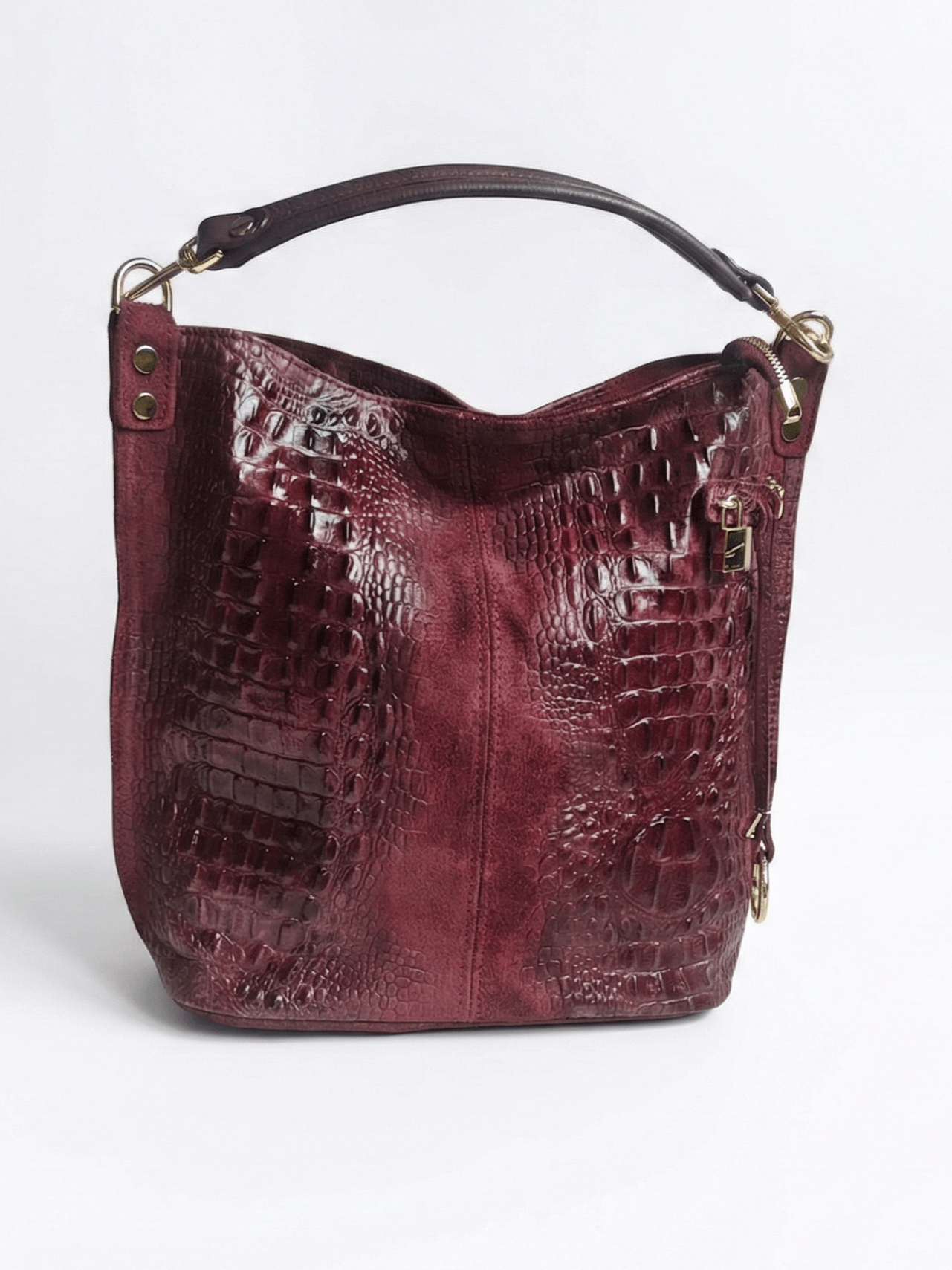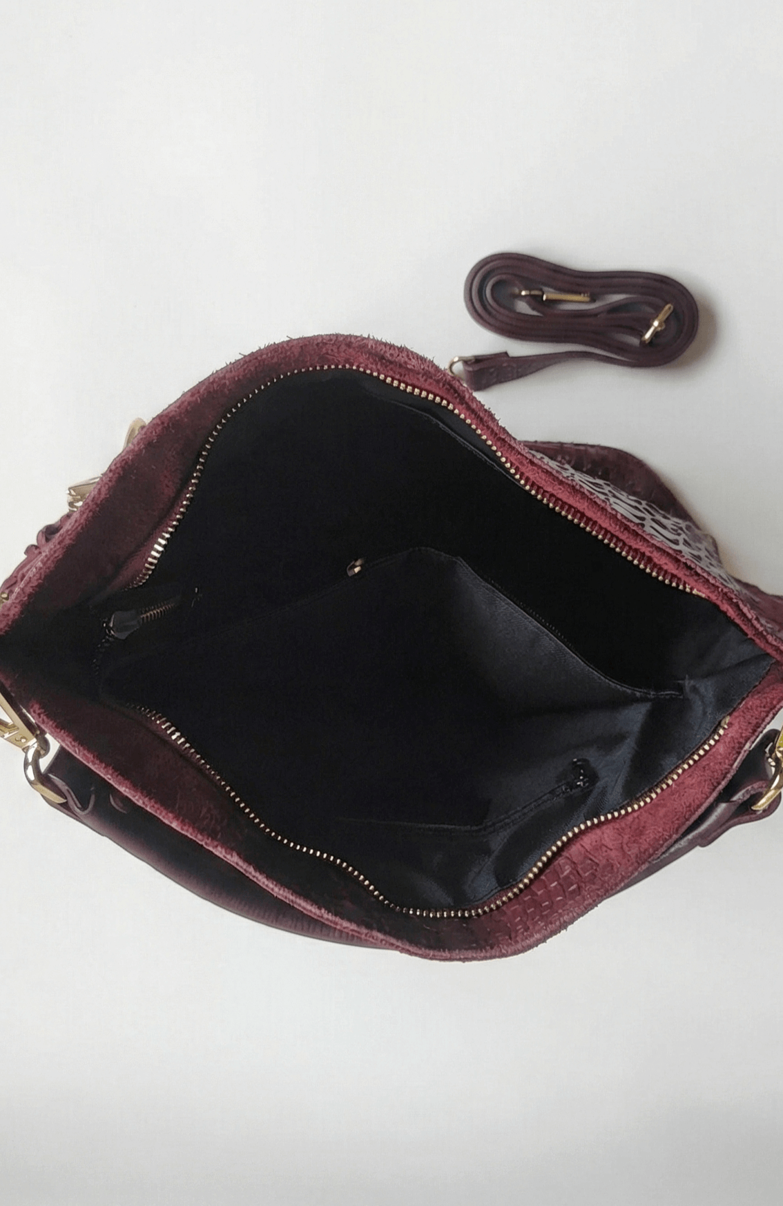 Women's bag made of natural suede with crocodile print - Bordeaux