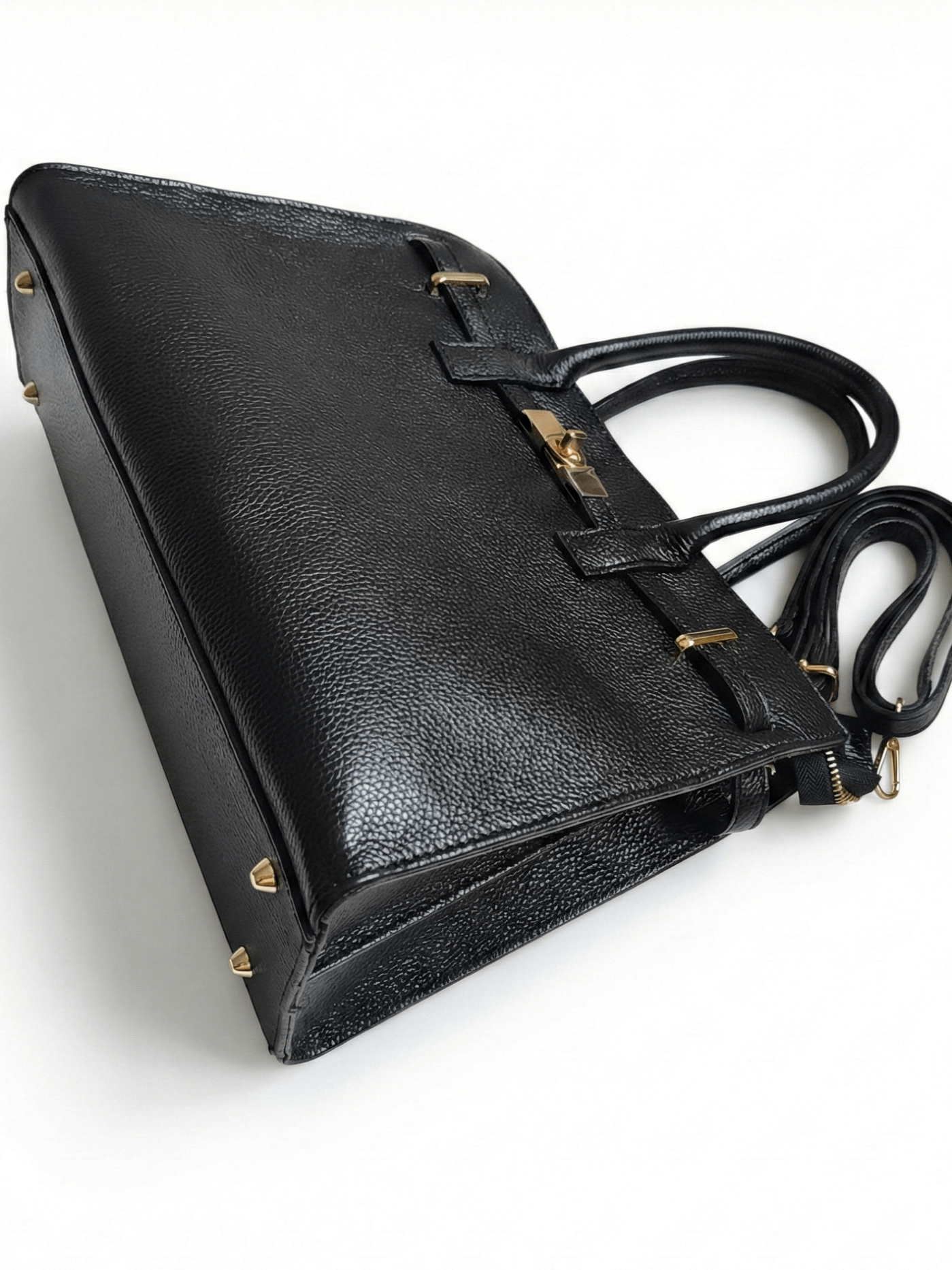 Design and Manufacture Made of high-quality genuine leather (Vera Pelle) with a beautiful texture, this bag in classic black exudes luxury and durability. Its strict silhouette is emphasized by elegant golden metal elements and a stylish "swivel clip" clasp on the front.