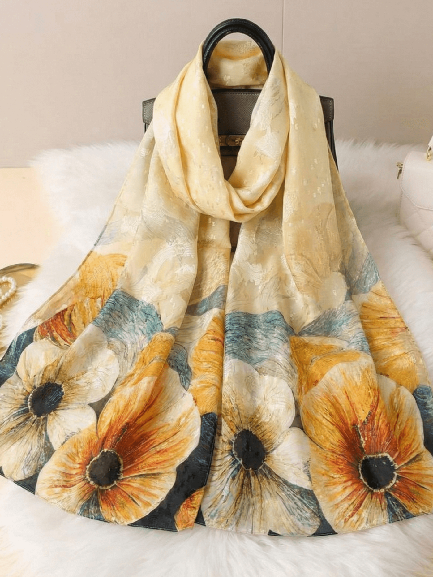 The design impresses with large, artistic flowers (anemonia type) in a warm range of yellow, ocher and gold, contrasting with delicate gray-blue leaves. The discreet texture of the fabric adds depth to the colors and makes the scarf suitable for both everyday life and special occasions.