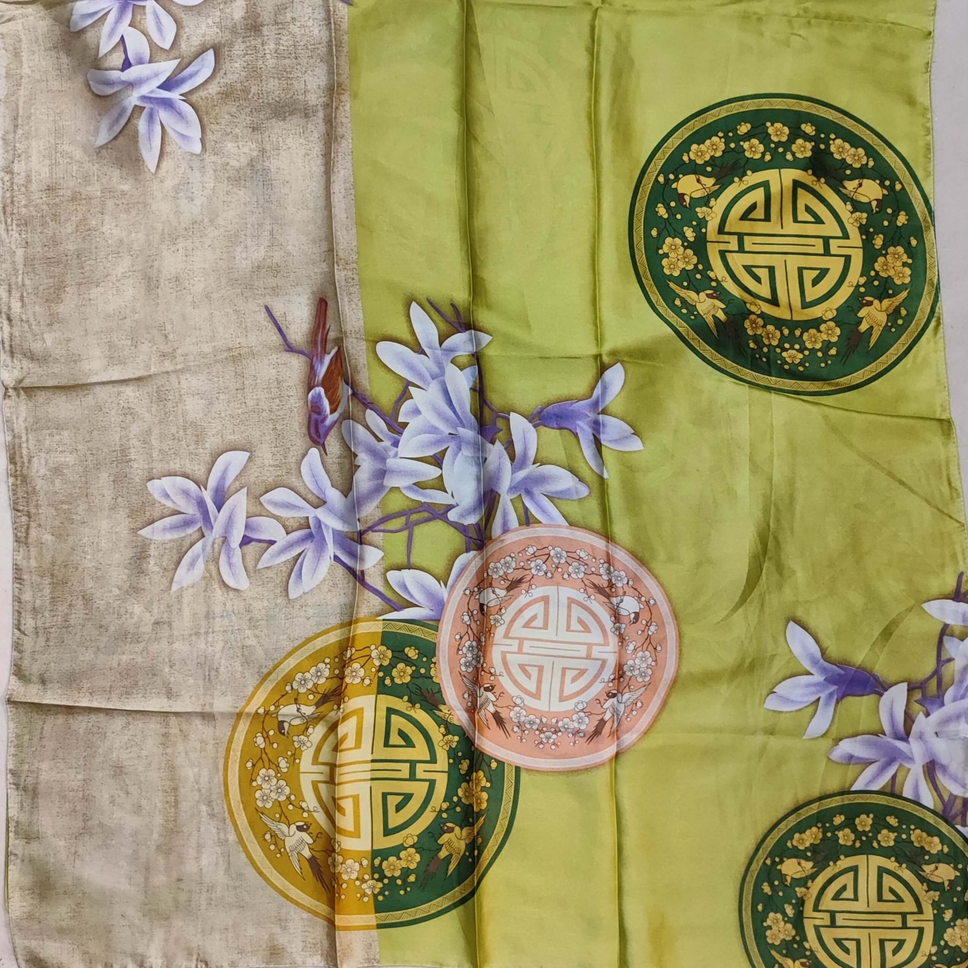 Fresh women's scarf in lime and beige with delicate purple flowers.