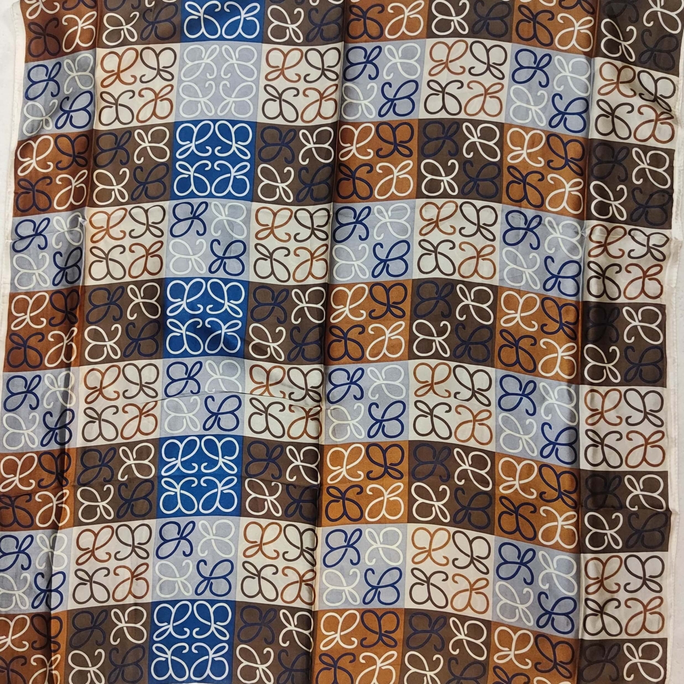 Add depth and sophistication to your wardrobe with this large satin scarf in a rich color palette. This model impresses with a stylish geometric print, combining warm shades of chocolate brown and caramel with contrasting accents in navy blue and pearl gray/white.