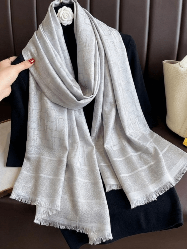 Transform your outfit with this exceptional silver scarf that combines classic elegance with modern glamour. The model features a delicate shiny thread (lame), discreetly woven into the fabric, which gives a luxurious glow without being intrusive.