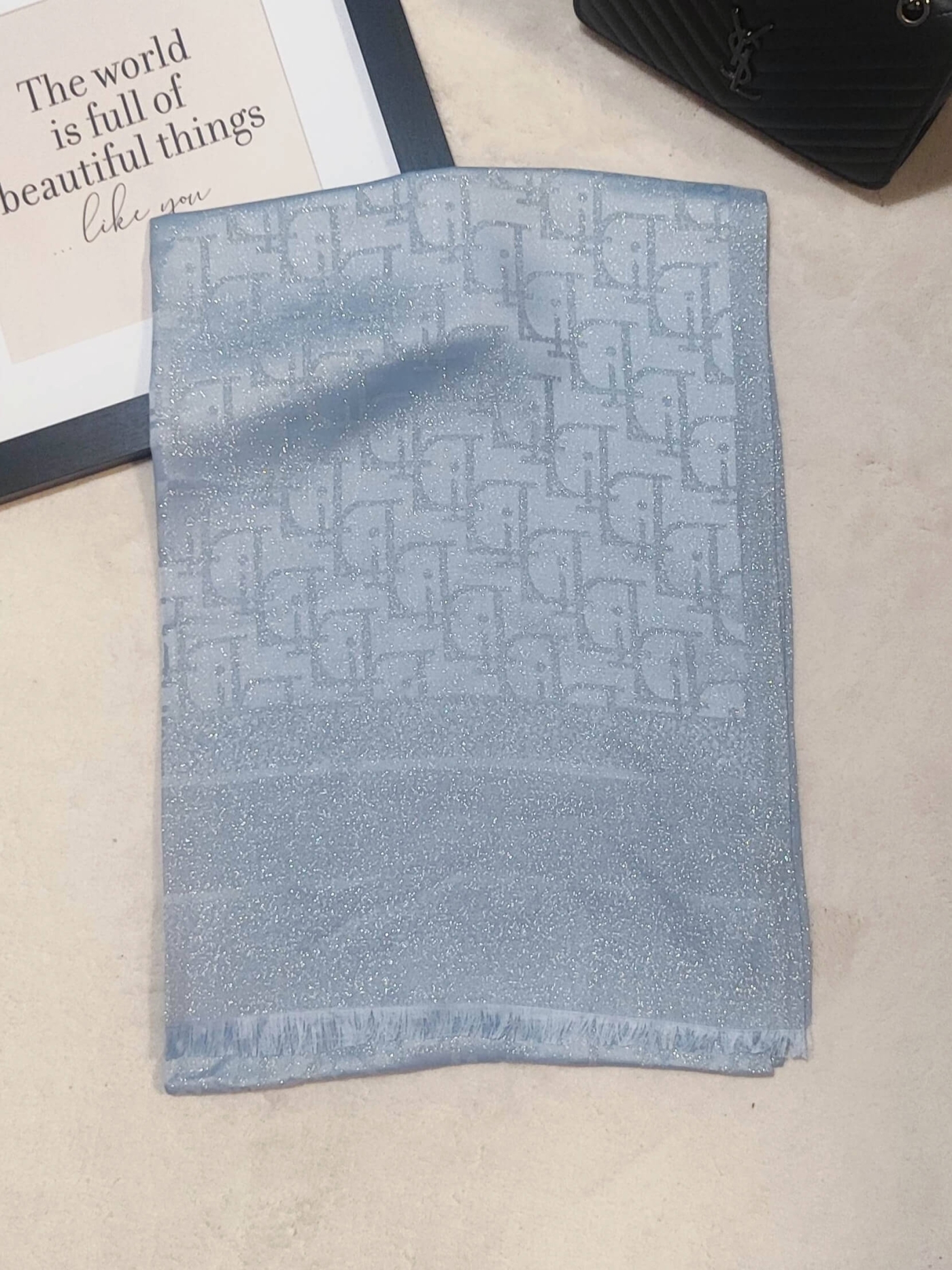 Elegant Blue scarf with shiny thread and letter pattern (Viscose and Cotton) – 70x190 cm