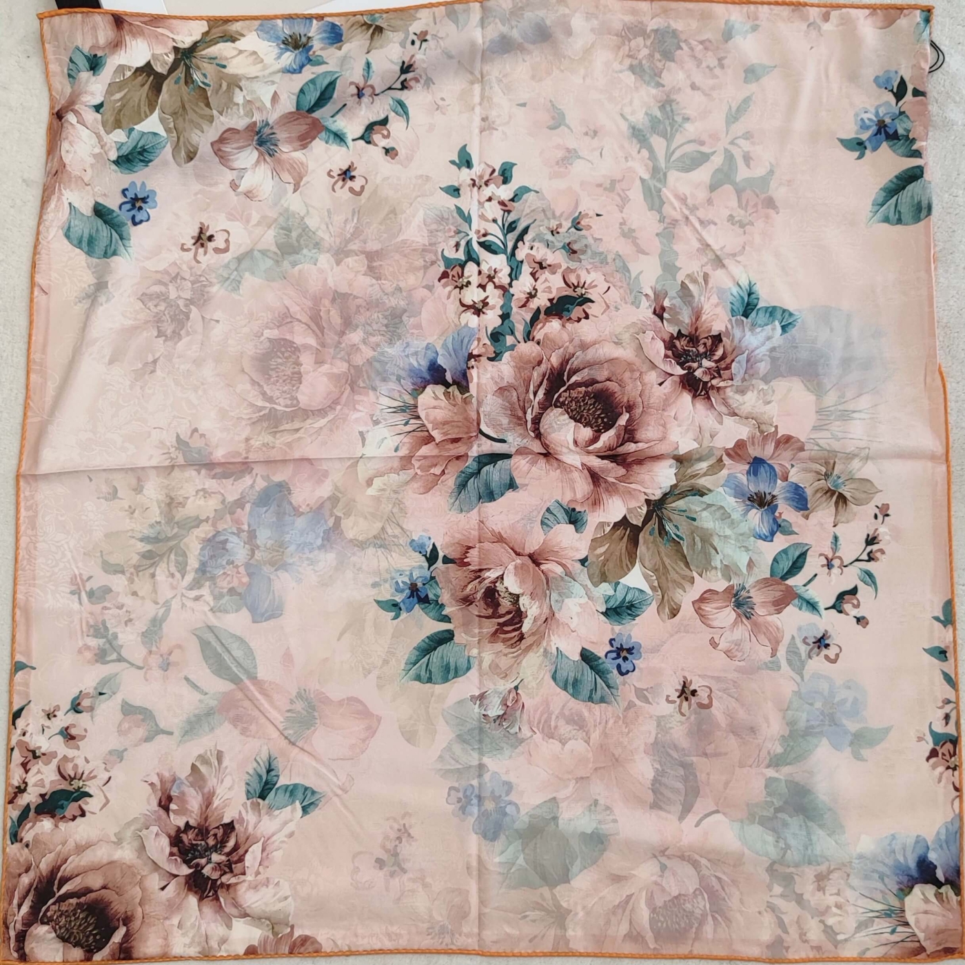 Add freshness, color and style to any outfit with this exquisite women's scarf. It features a rich floral print on a soft light background, beautifully framed by an elegant orange border.