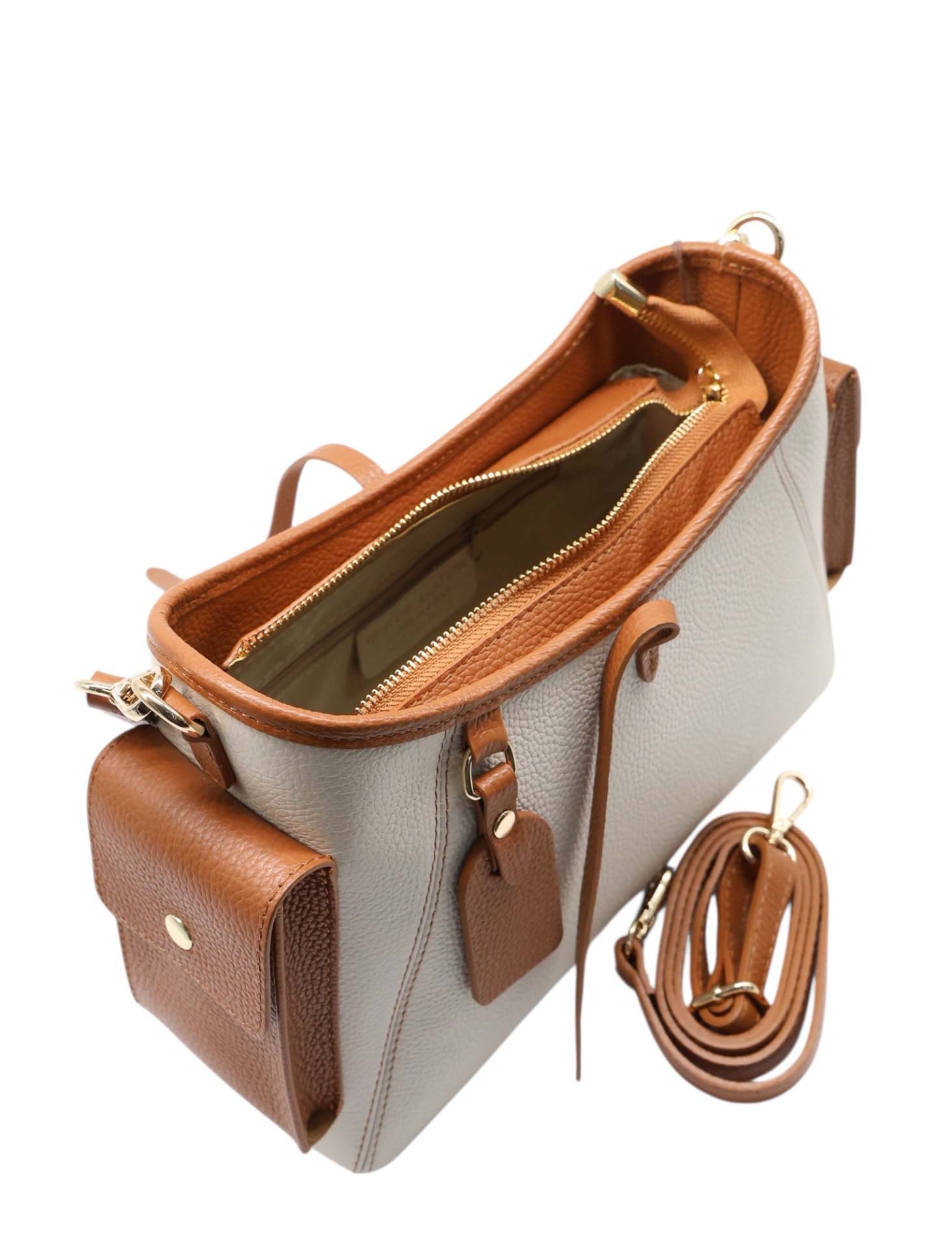 Emphasize your style with this sophisticated handbag made in Italy. The beautiful contrast between the light base and the camel-colored details, combined with the golden metal elements, creates an elegant look for any situation. The side pockets provide quick access to the most important things, making the model perfect for dynamic everyday life.