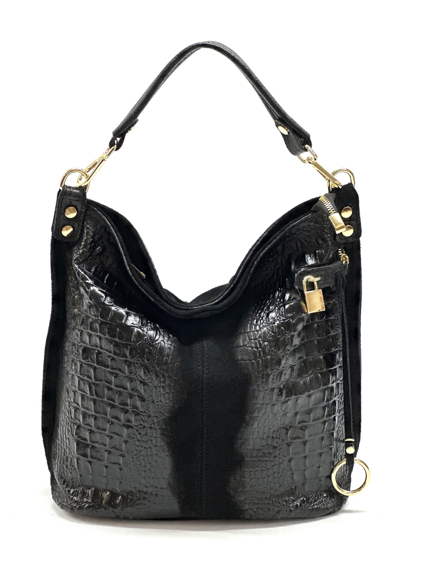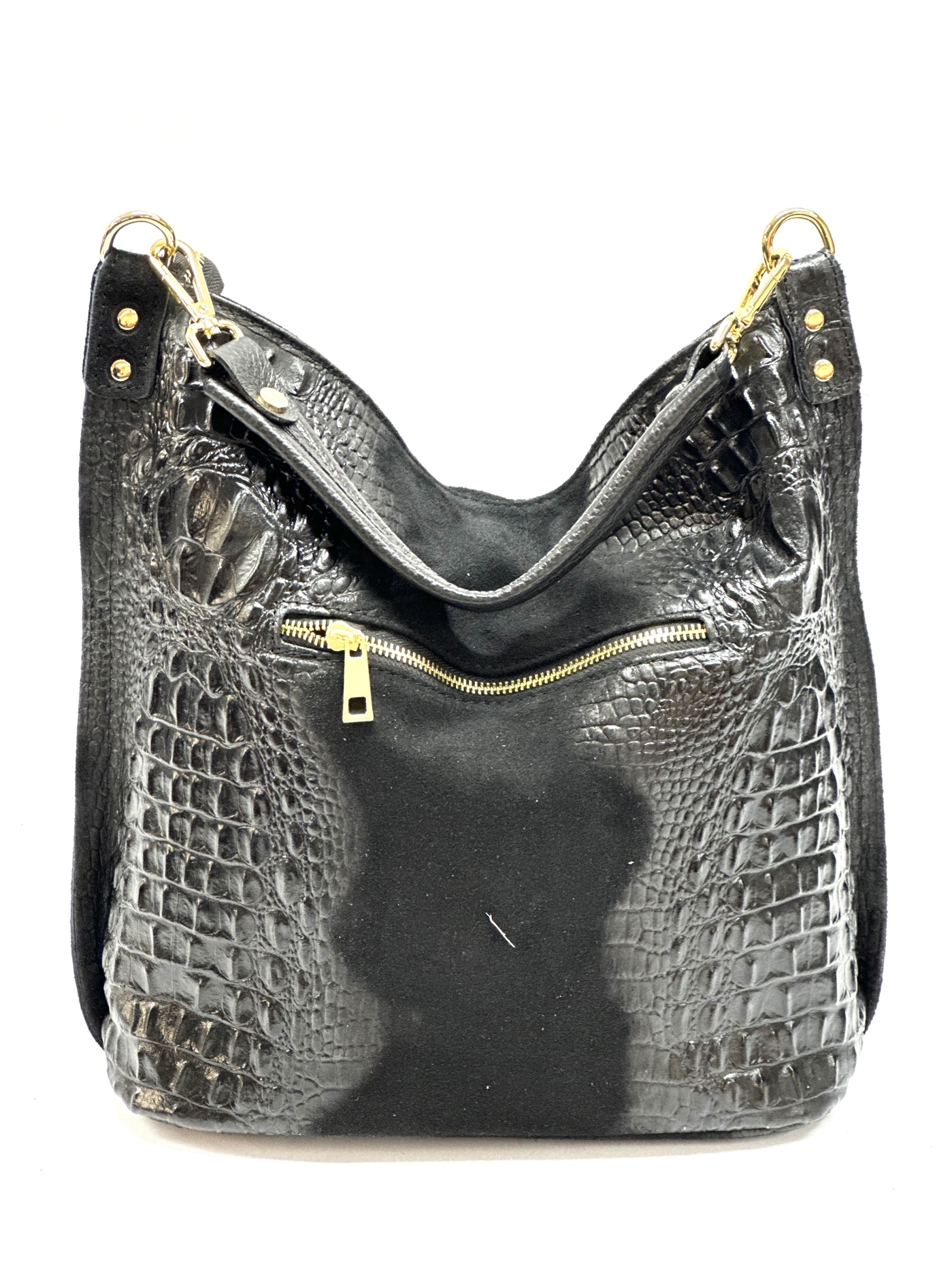 Elegant handbag made of a combination of natural leather and suede with a spectacular crocodile print.
