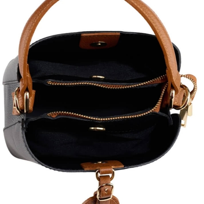 Italian Two-Tone Genuine Leather Handbag – Classic Black and Cognac
