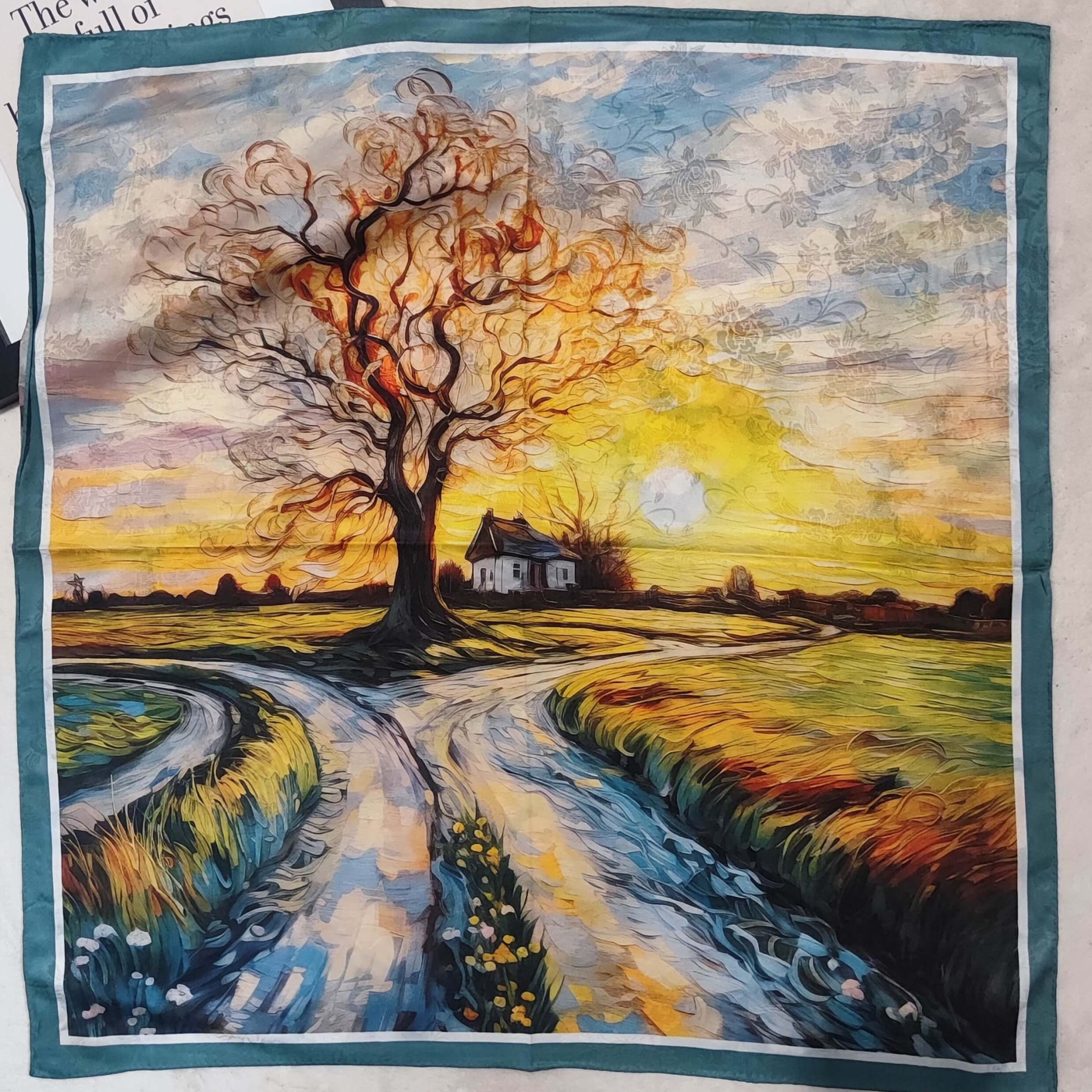 The scarf impresses with its two different, yet harmoniously flowing motifs. On one side you will find a picturesque landscape with a sunset, a lone tree and a country road, which brings a sense of peace and warmth. On the other side, a delicate pattern of classic vintage roses unfolds. This allows you to fold and tie it in different ways, showing a different side of its design according to your mood and outfit.