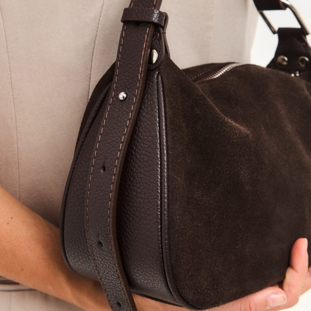Discover the perfect balance between texture and sophistication with this brown Italian bag. The model combines the softness of natural suede with the durability of high-quality genuine leather, creating an accessory that not only looks luxurious, but is also designed to last.