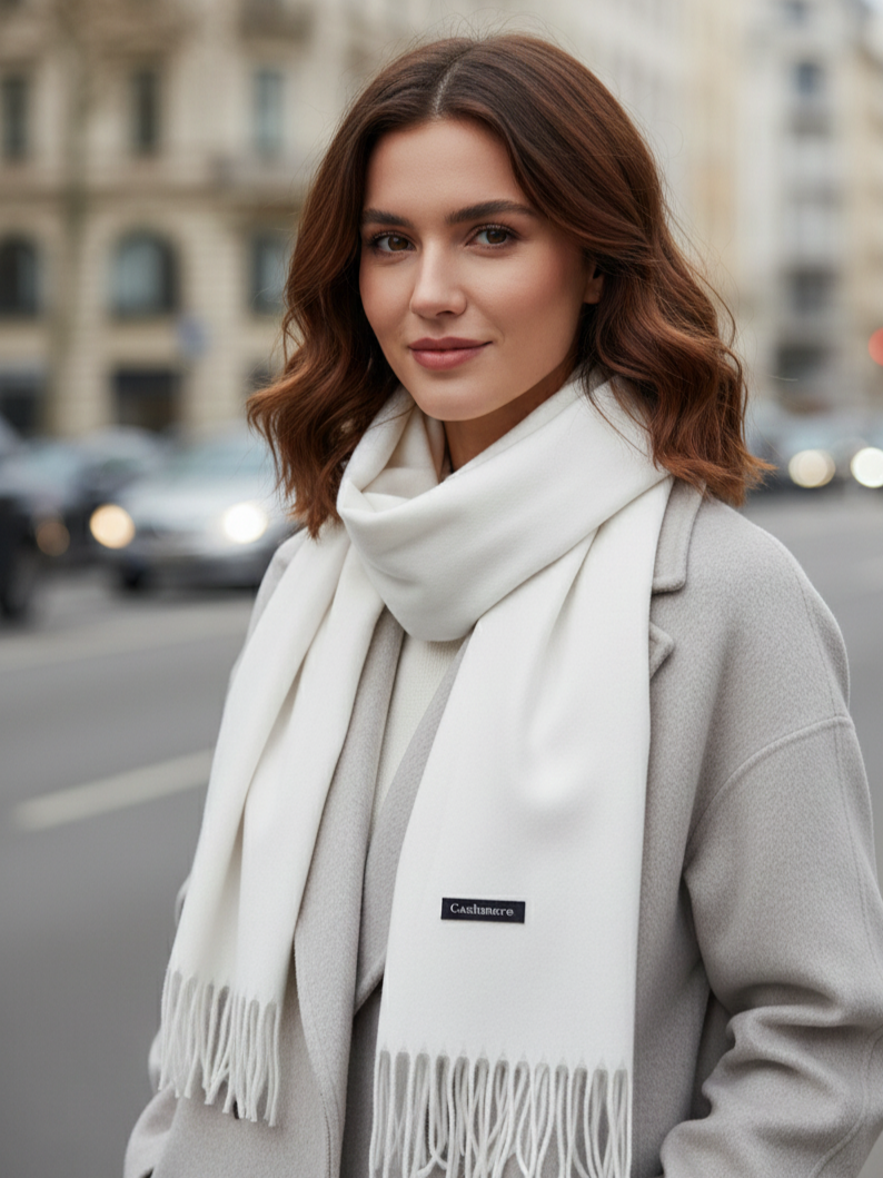 Едноцветен кашмирен шал в бяло – елегантен и топъл.