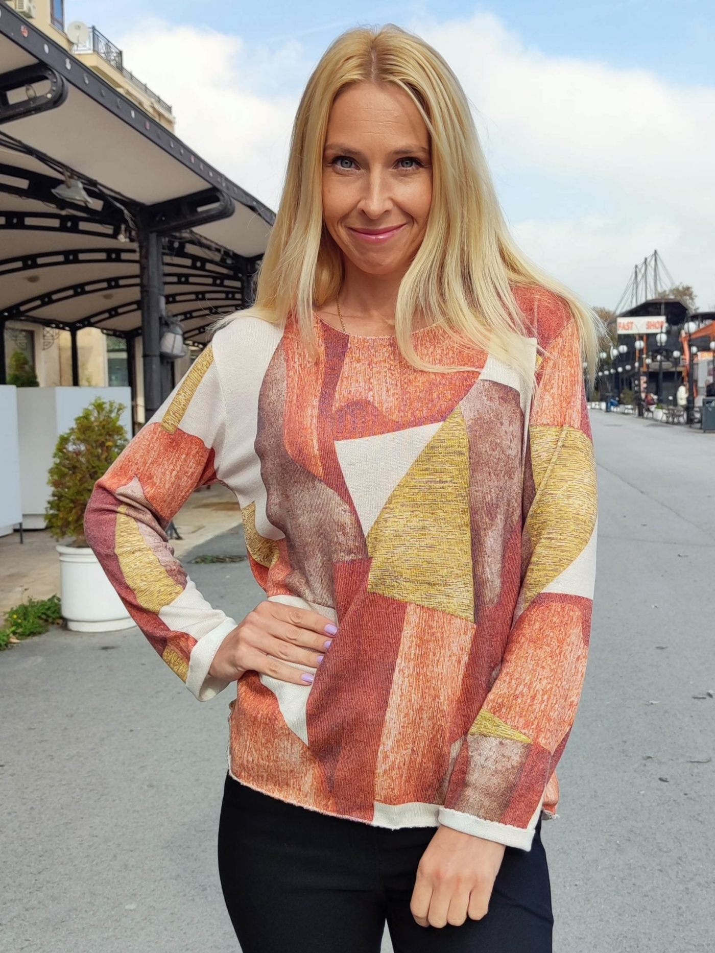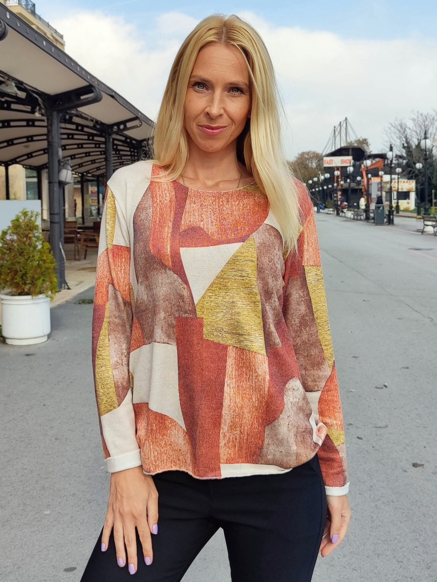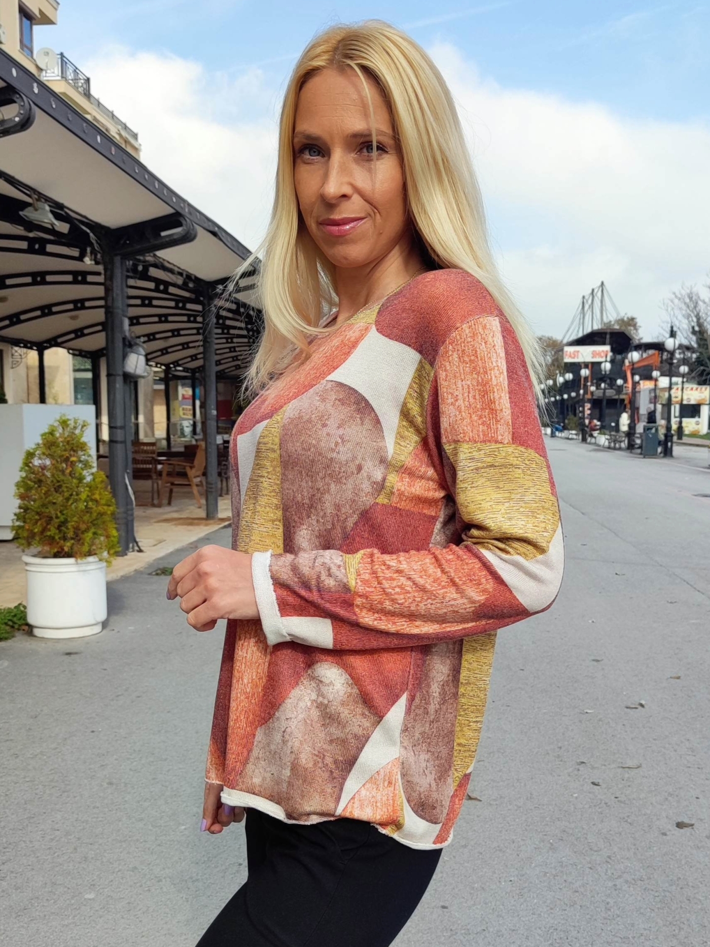 Елегантна дамска блуза с геометричен принт в оранжево-кафеви тонове.