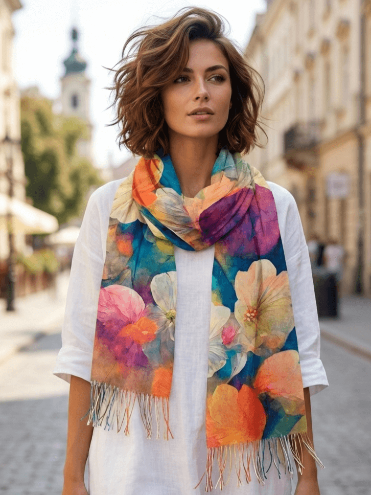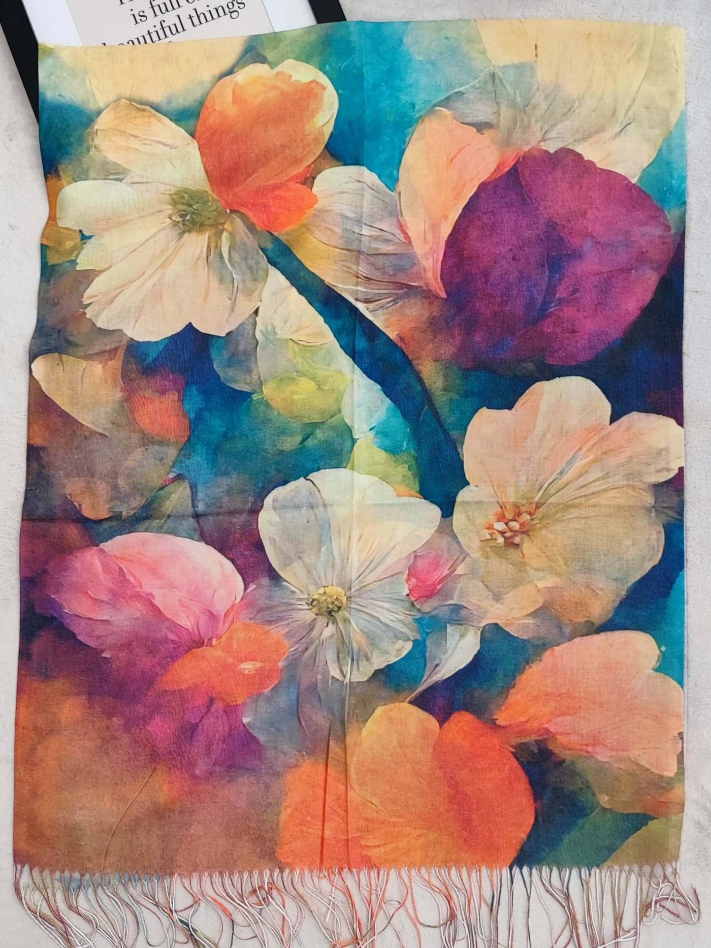 Освежете визията си с този мек памучен шал с живописен флорален принт.