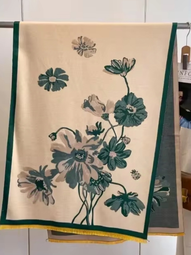 Добавете елегантен акцент към зимната си визия с този дамски шал с флорални мотиви. Моделът комбинира меко бежово и маслено зелено, украсени с деликатни цветя . Изработен е от модал и вълна, която осигурява топлина и уют през студените месеци. Перфектно допълнение към палто или зимно яке, този шал е идеален за ежедневно носене или като стилен аксесоар за специални поводи.
