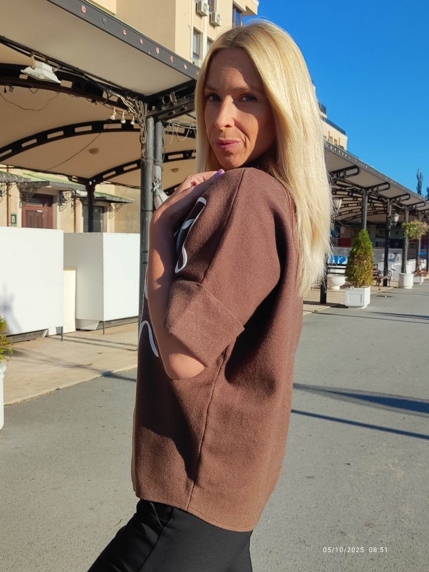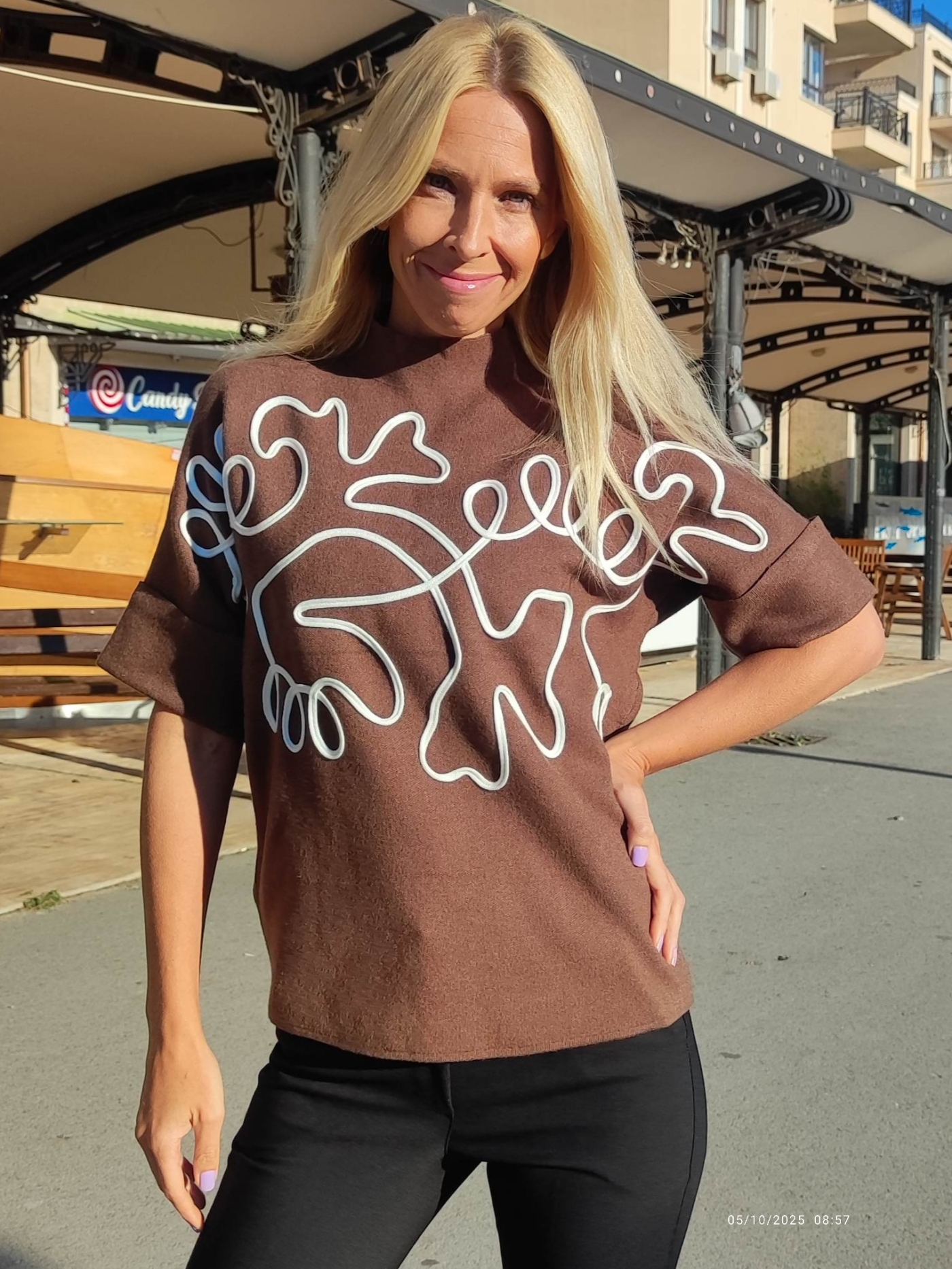 Дамски пуловер в кафяво с къс ръкав и апликация