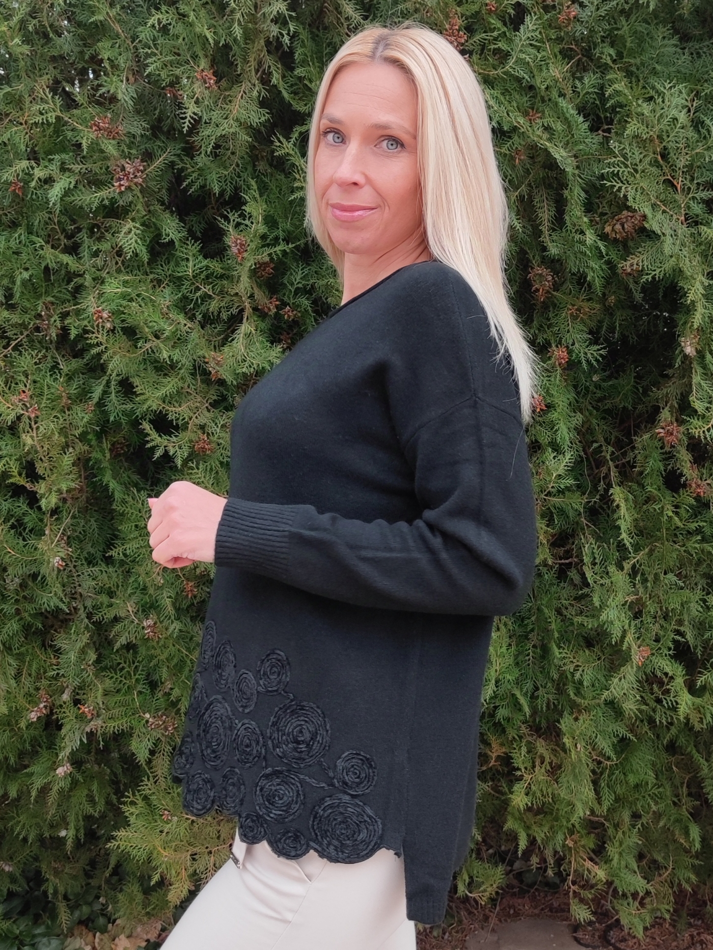 Дамски пуловер в черно с кръгове