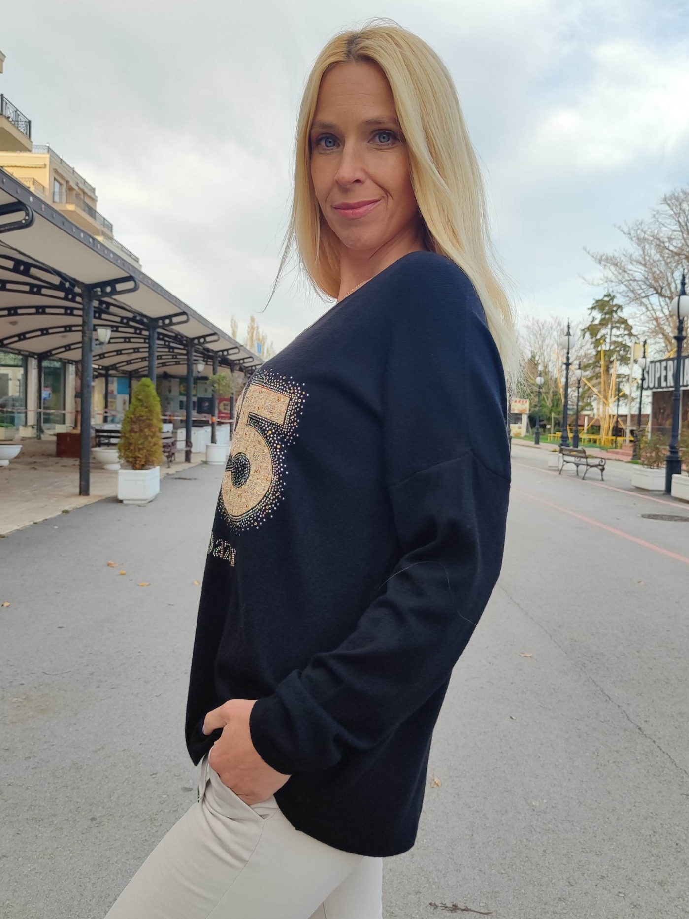 Изработен от мека и приятна на допир материя, той съчетава стил и удобство във всяка ситуация. V-образното деколте подчертават женствеността, а уникалната апликация с блестящи елементи отпред добавя нежен акцент и индивидуалност. Перфектен както за ежедневието, така и за по-елегантни визии.