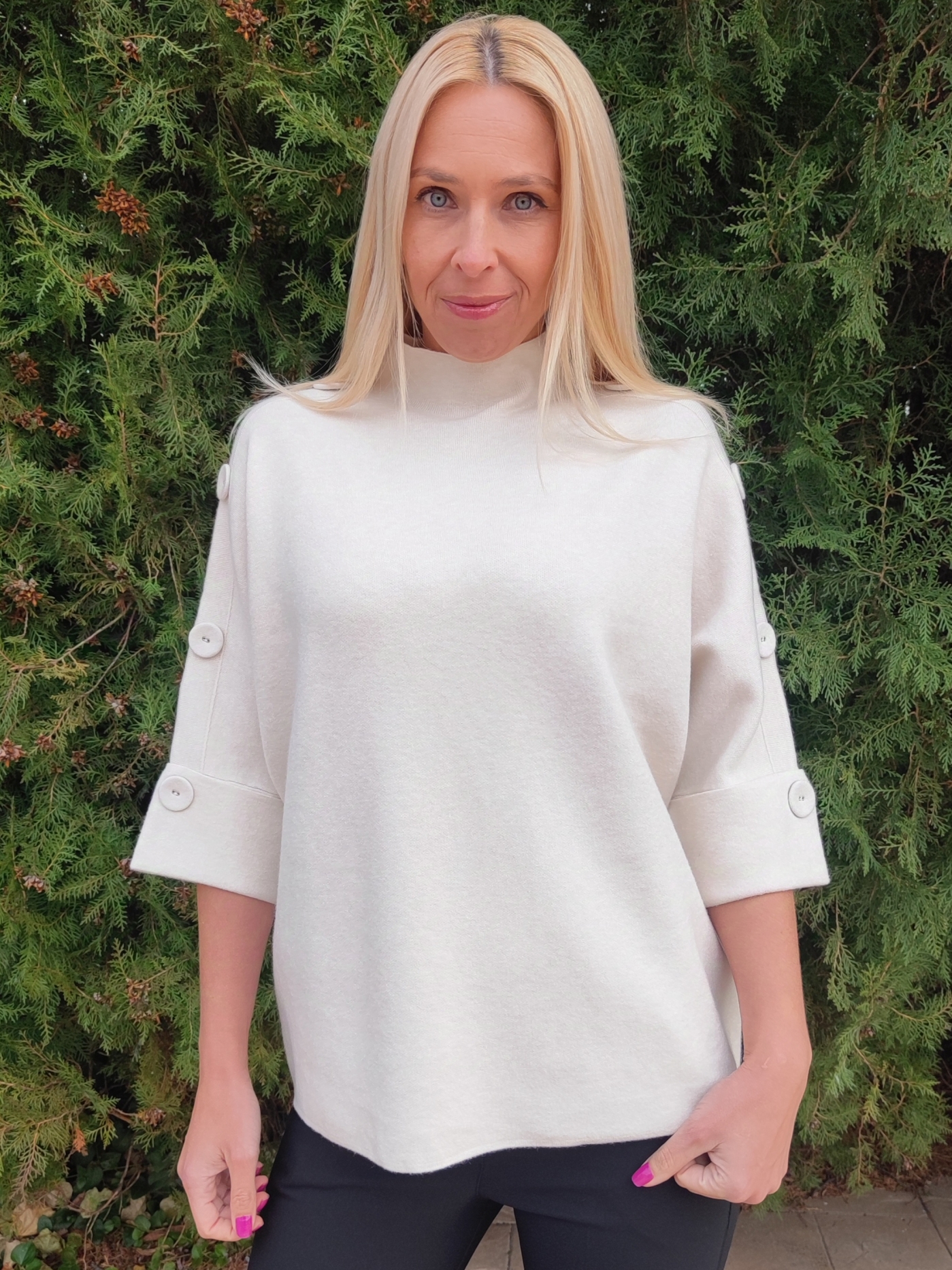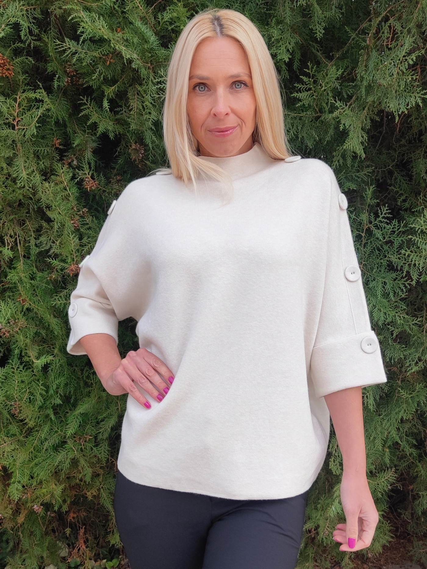 Преоткрий есенно-зимната визия с този елегантен дамски пуловер в цвят екрю, изработен от мека и топла материя. Съчетава минималистичен стил с модерни акценти – широки 3/4 ръкави и декоративни копчета по ръкавите и рамото, които придават уникалност и характер на визията.