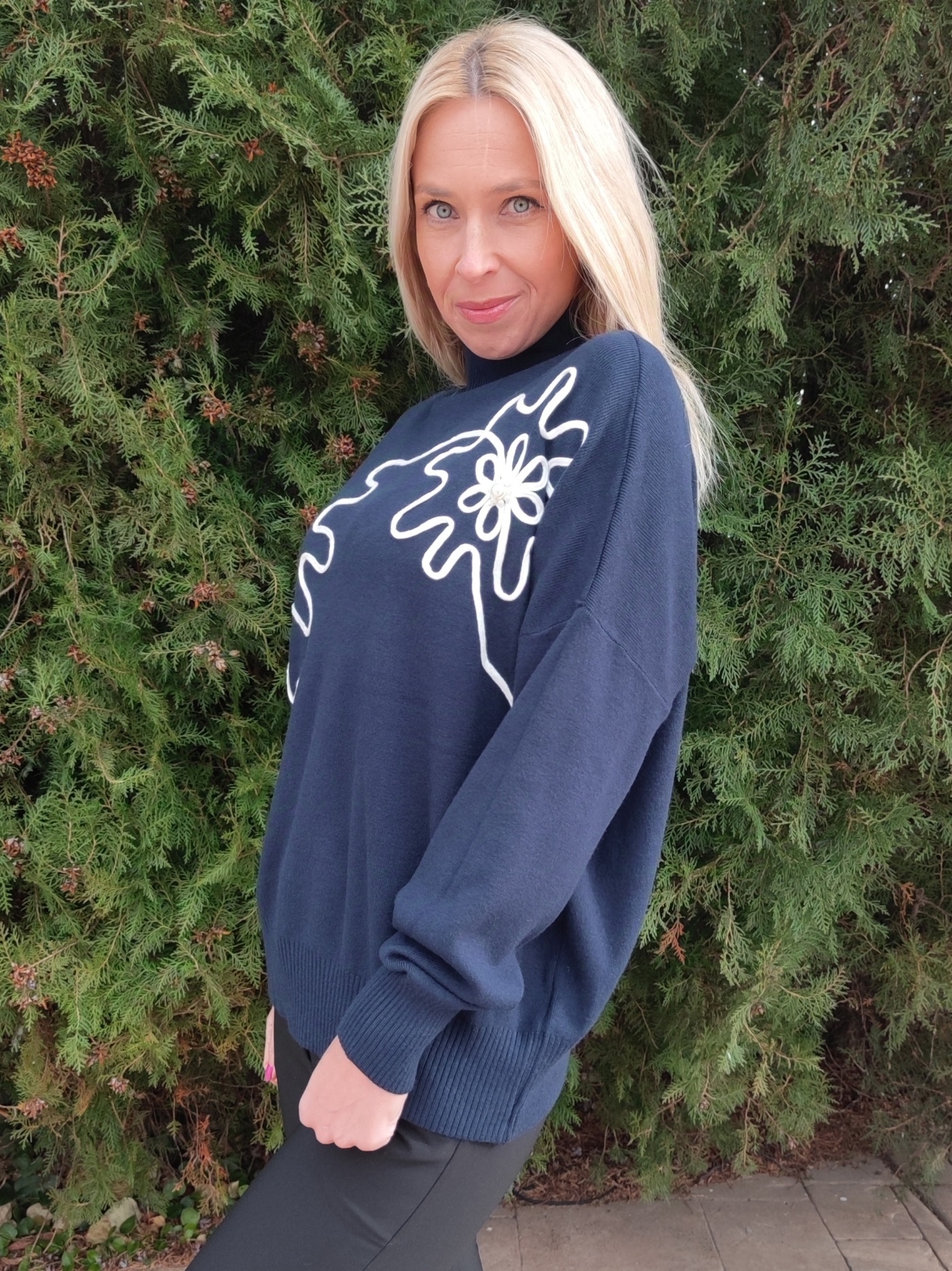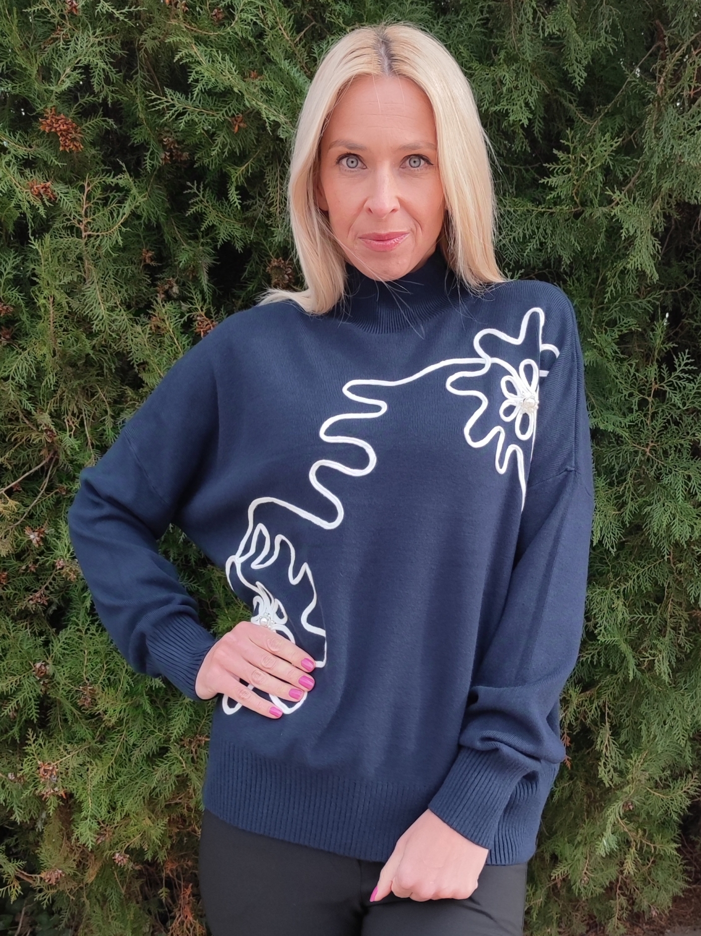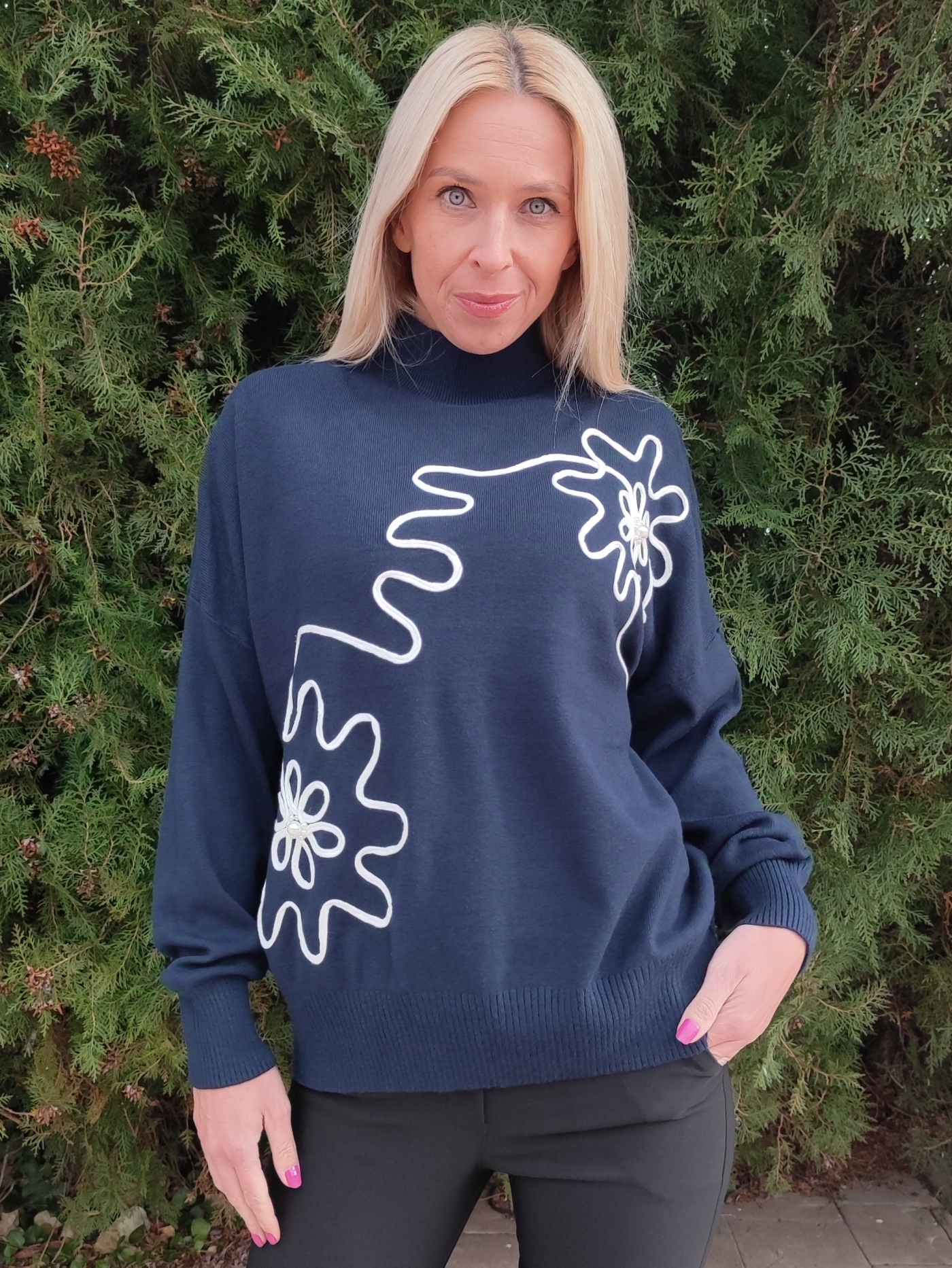Този дамски пуловер с поло яка в стилен тъмносин цвят е перфектното попълнение към вашия есенно-зимен гардероб. Акцентира с артистични бели апликации във формата на цветя и абстрактни линии, придаващи му уникален характер. Изработен от мека и топла материя, пуловерът предлага удобство и стил за всеки ден.