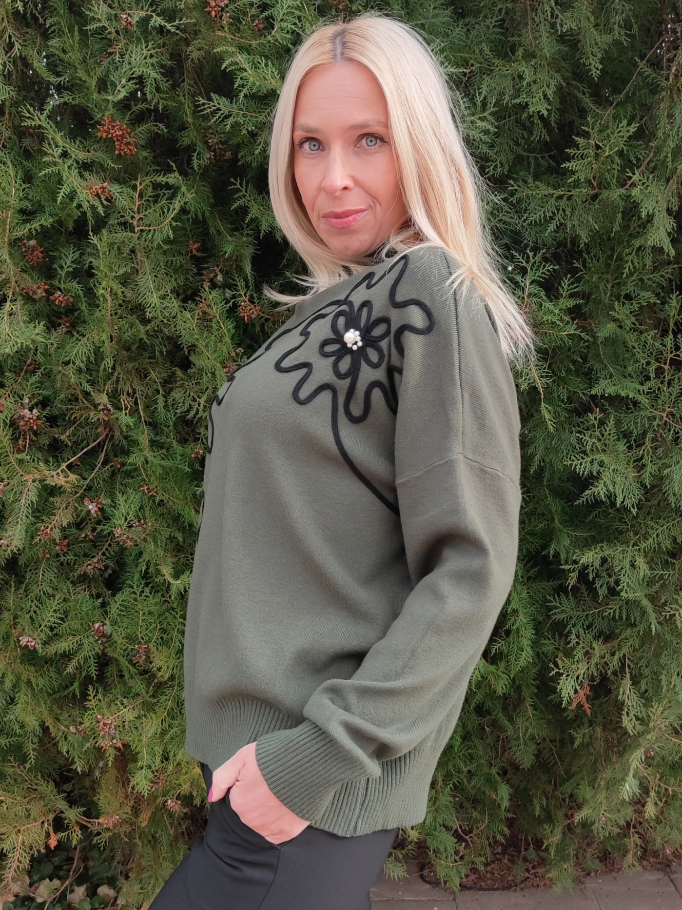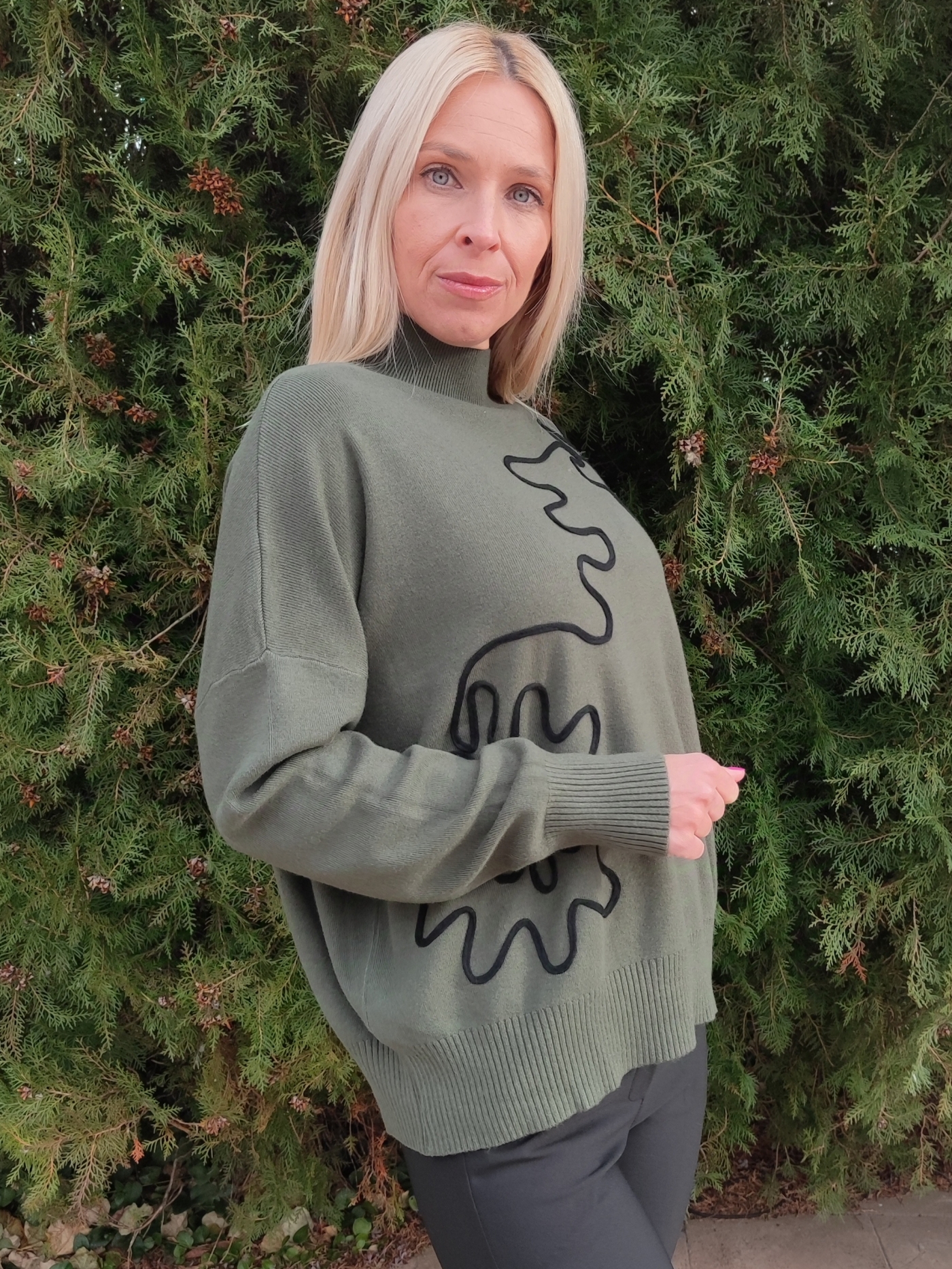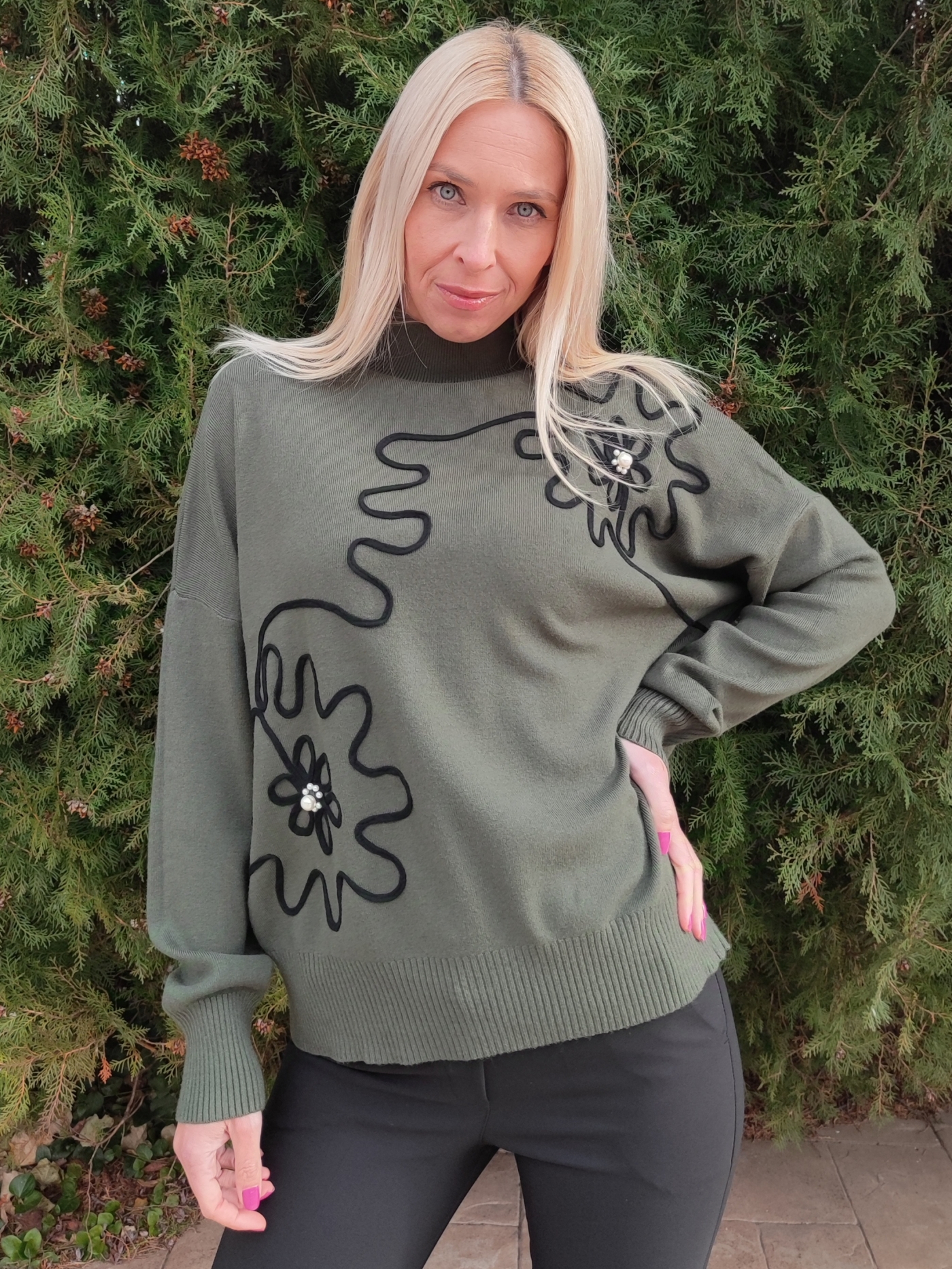 Този дамски пуловер с поло яка в зелен цвят е перфектното попълнение към вашия есенно-зимен гардероб. Акцентира с артистични бели апликации във формата на цветя и абстрактни линии, придаващи му уникален характер. Изработен от мека и топла материя, пуловерът предлага удобство и стил за всеки ден.
