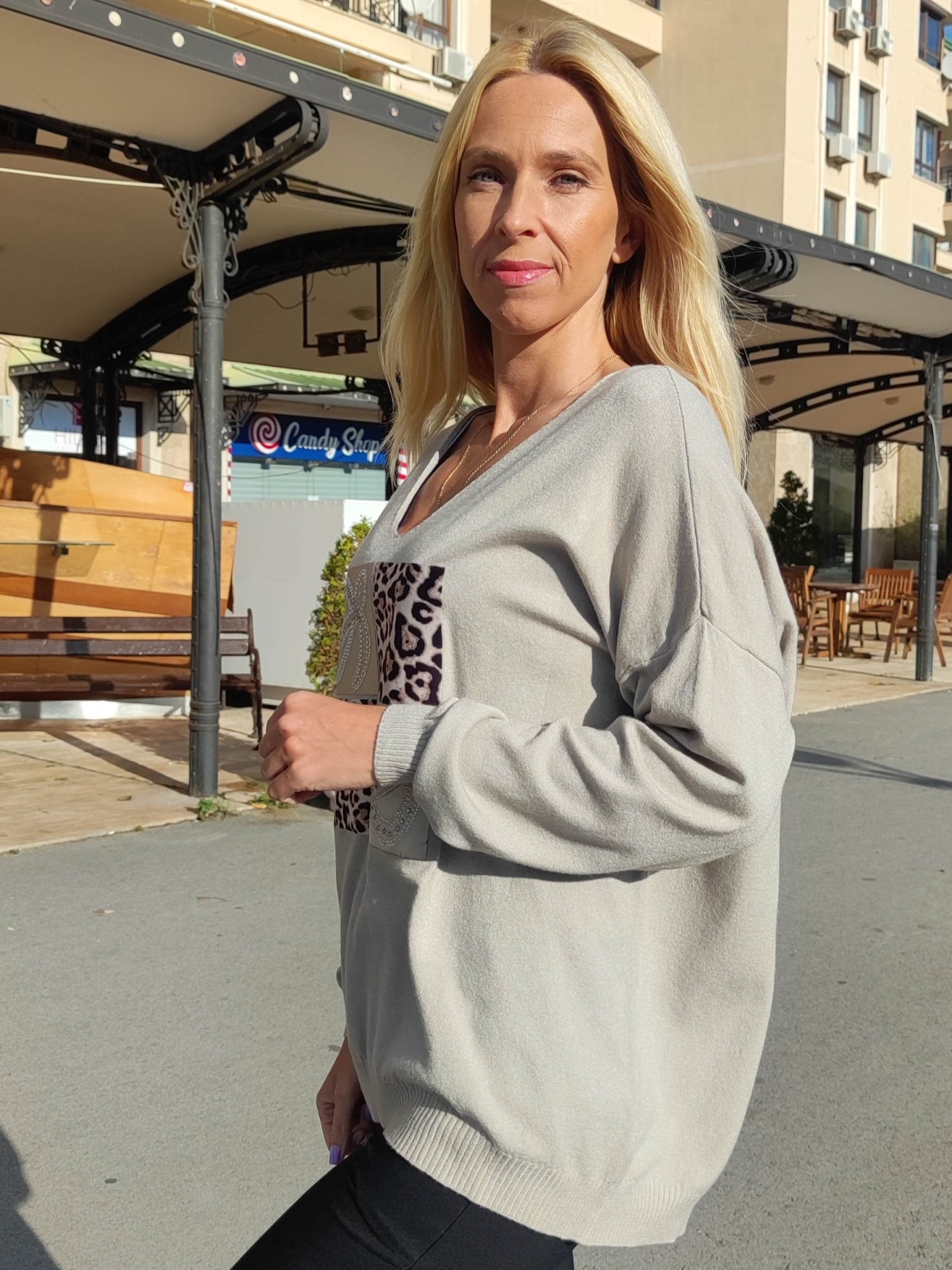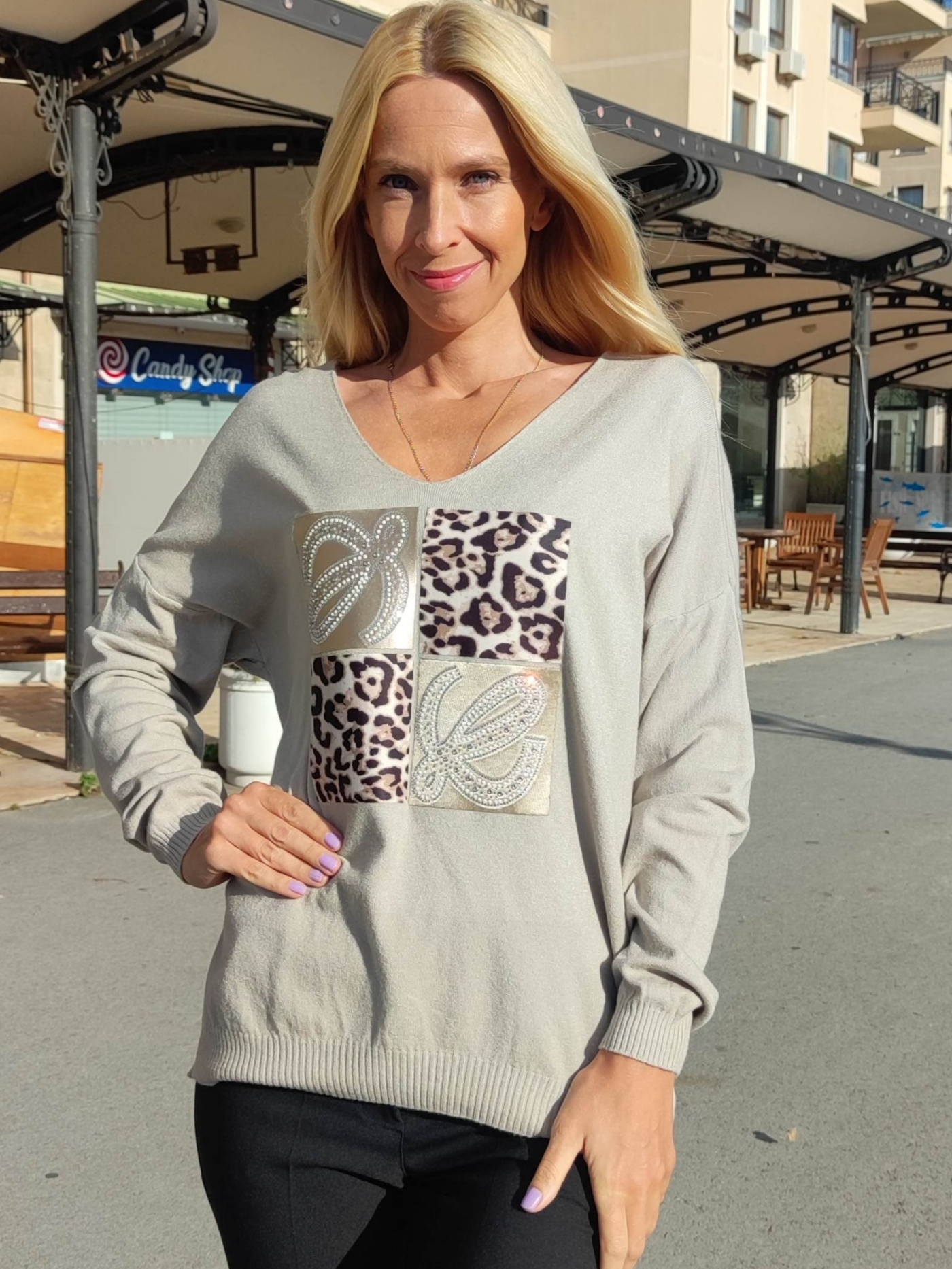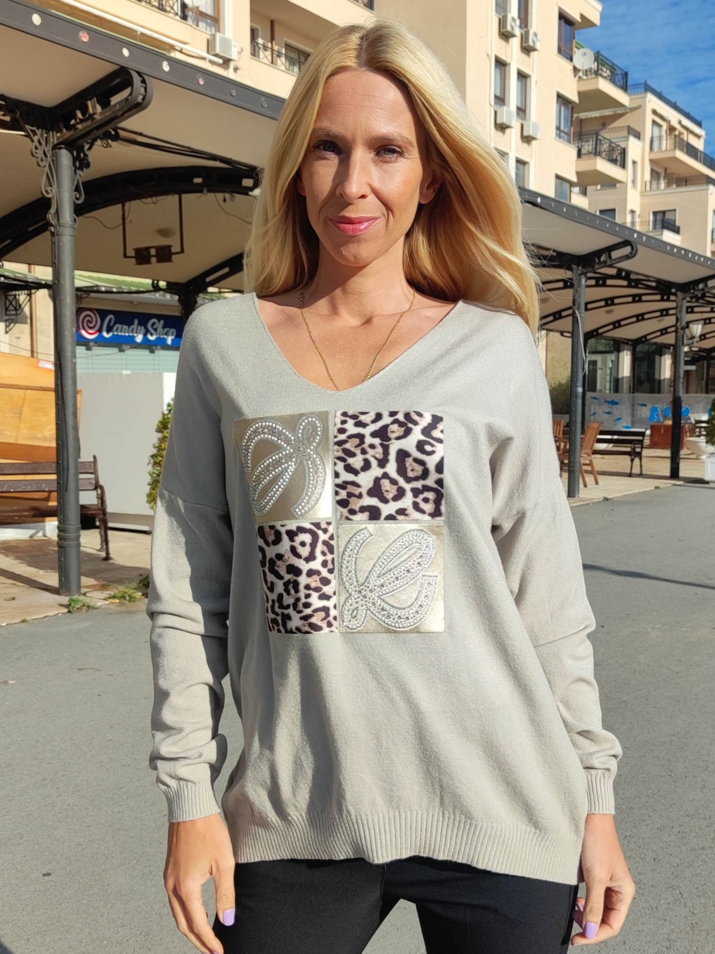 Изработен от мека и приятна на допир материя, той съчетава стил и удобство във всяка ситуация. V-образното деколте подчертават женствеността, а уникалната апликация с блестящи елементи отпред добавя нежен акцент и индивидуалност. Перфектен както за ежедневието, така и за по-елегантни визии.