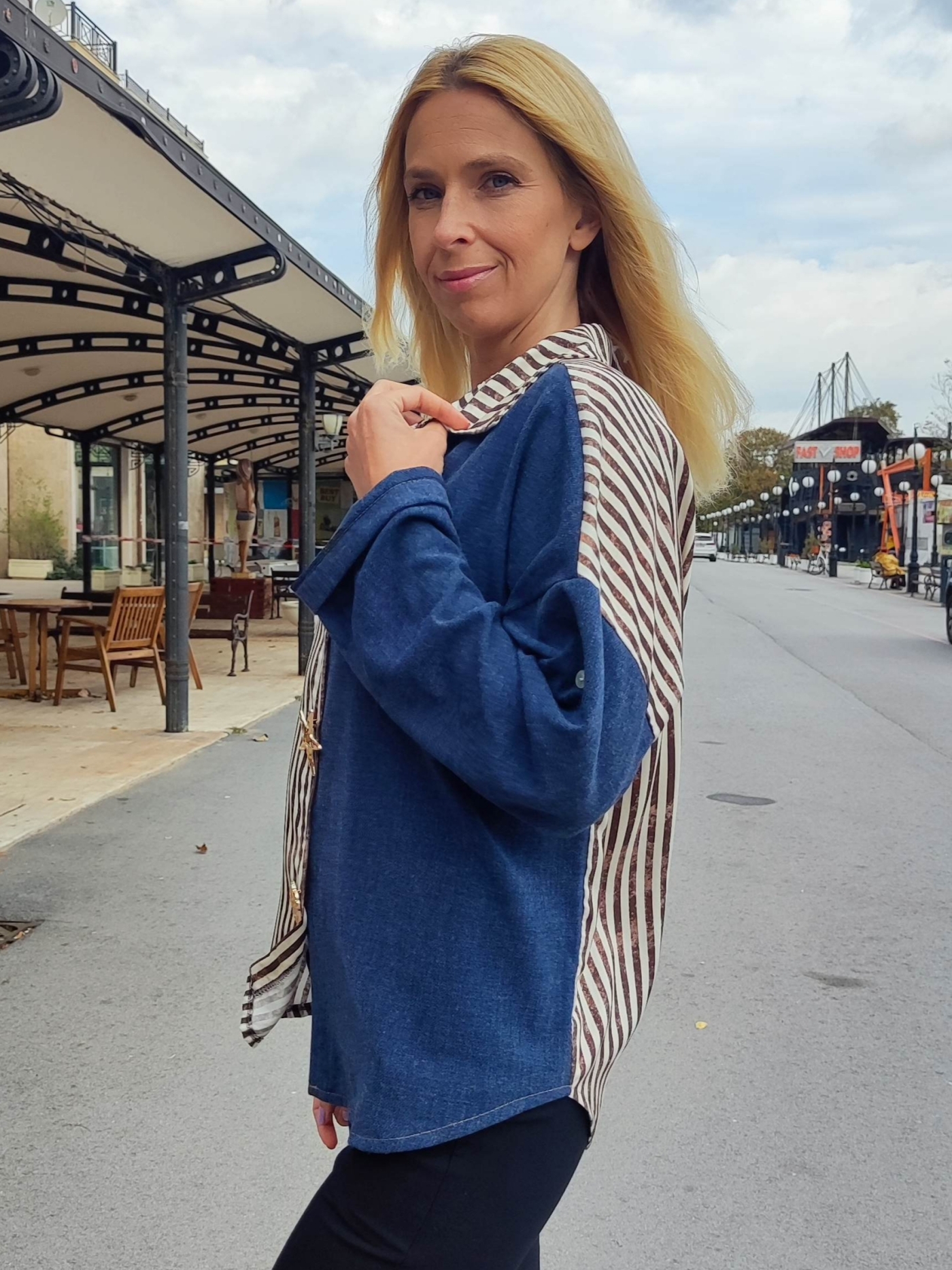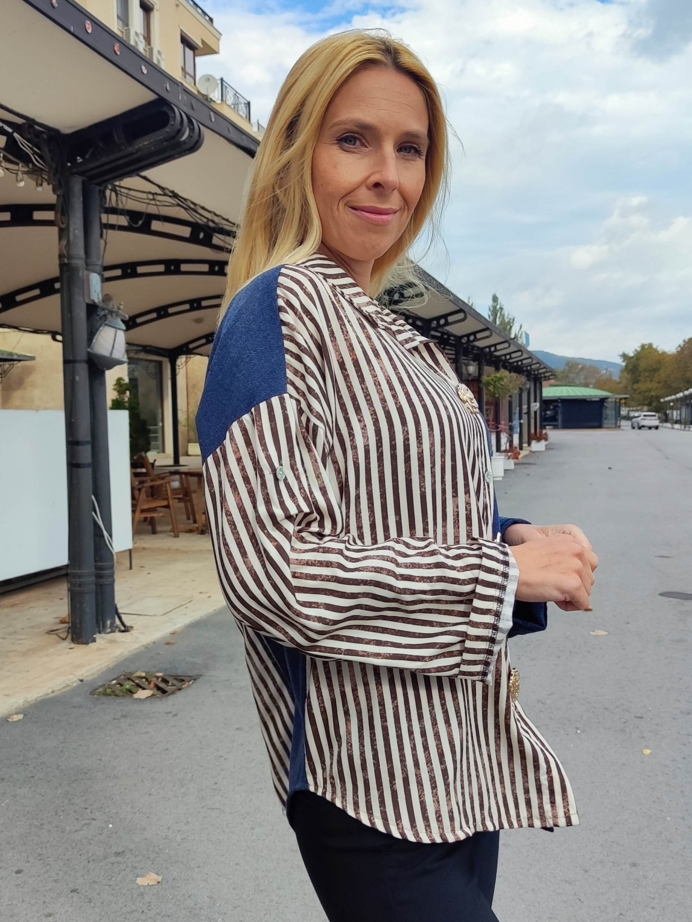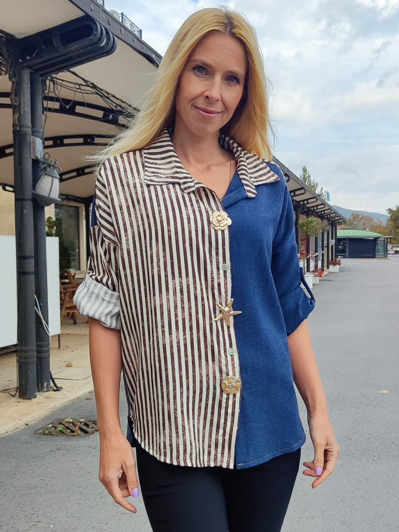Открий уникалния чар на дамската риза „Деним и райе“ – перфектната комбинация между елегантен стил и ежедневен комфорт. Моделът впечатлява с креативен дизайн – половината е от мек син деним, а другата с елегантно кафяво-бяло райе.