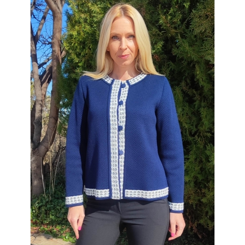 Елегантна дамска жилетка в тъмносиньо с бял кант