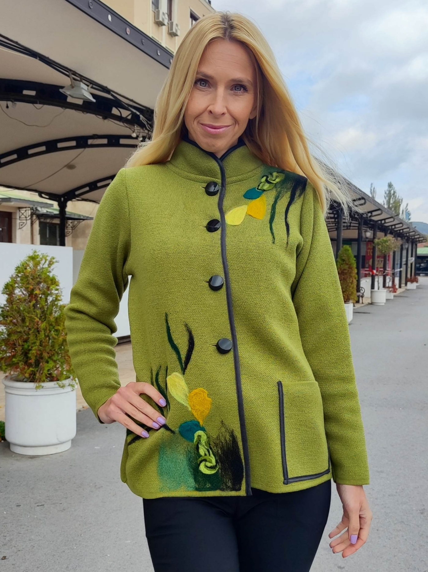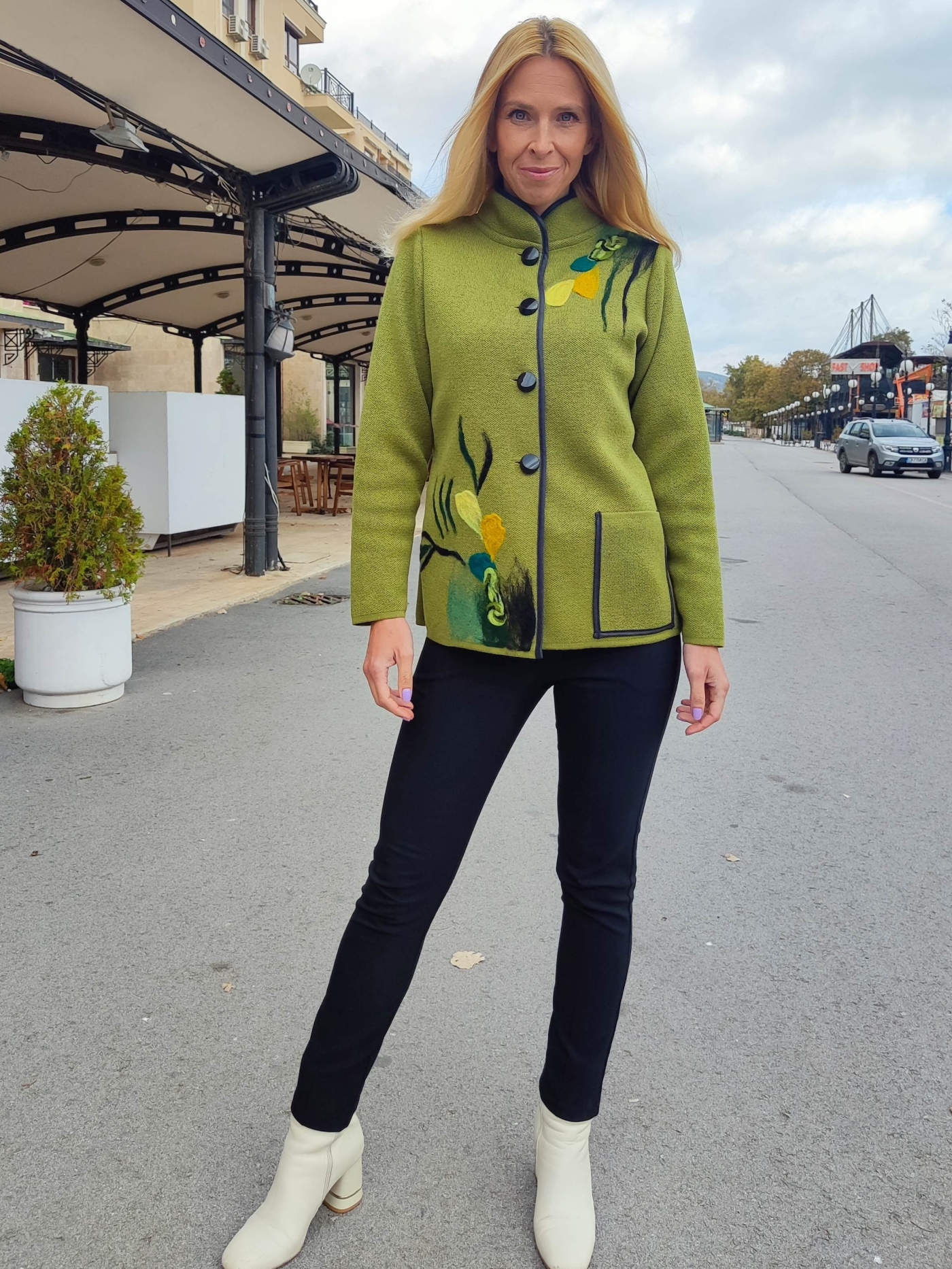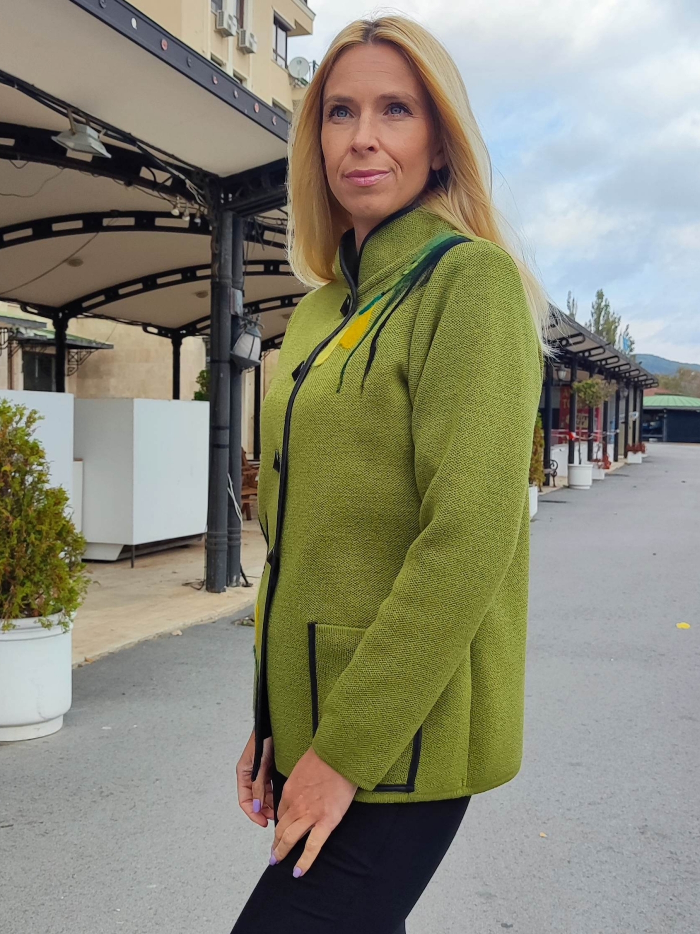 Дамска жилетка в маслинено зелено с артистичен флорален дизайн