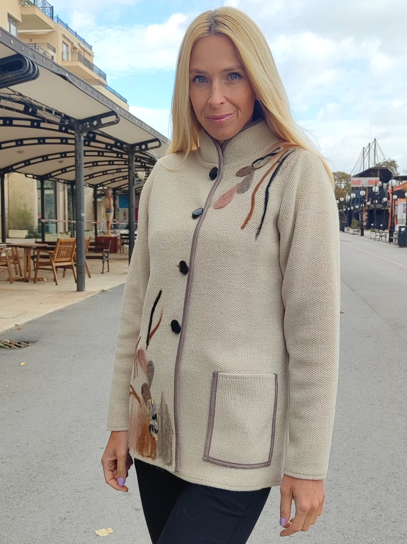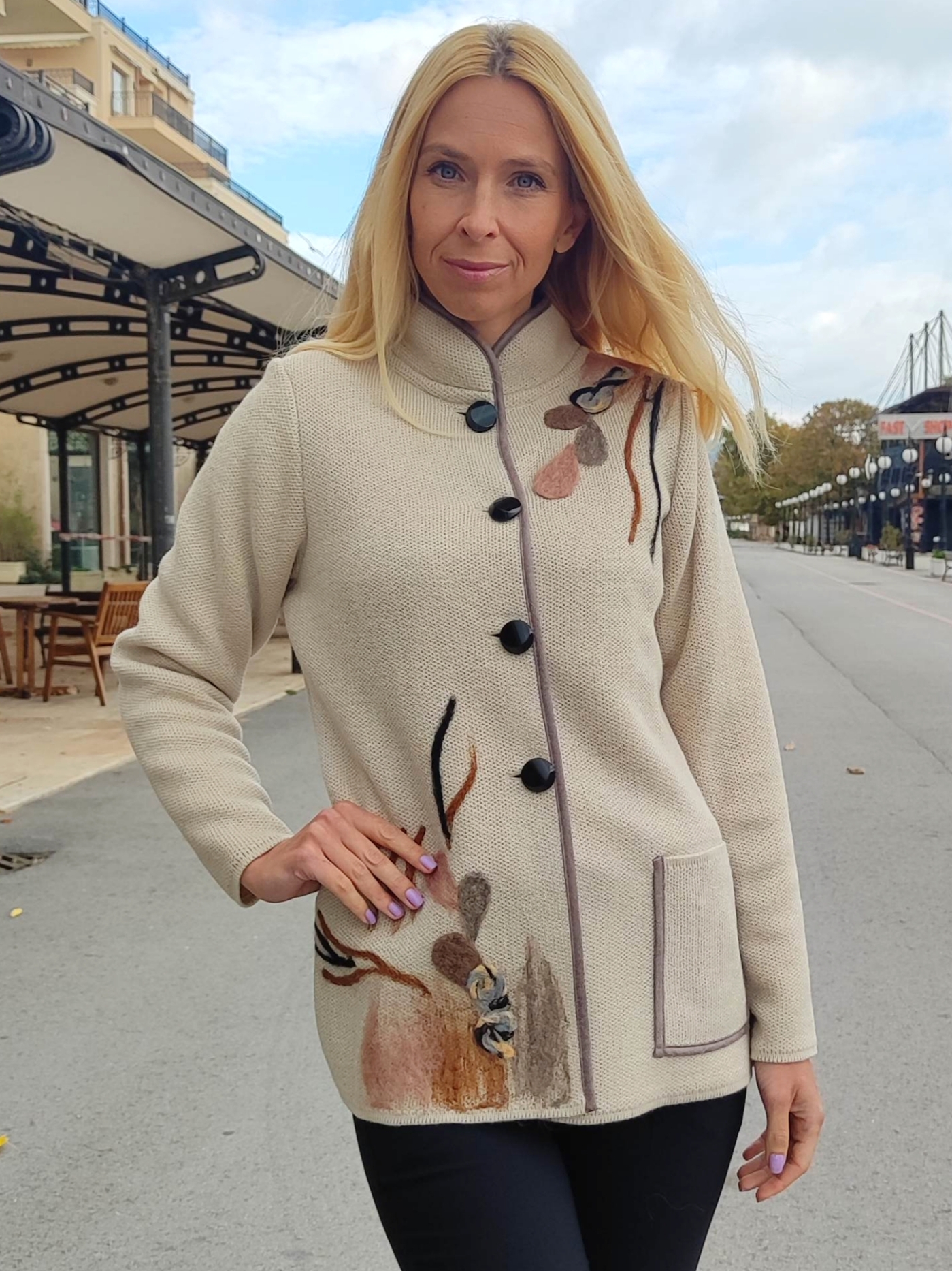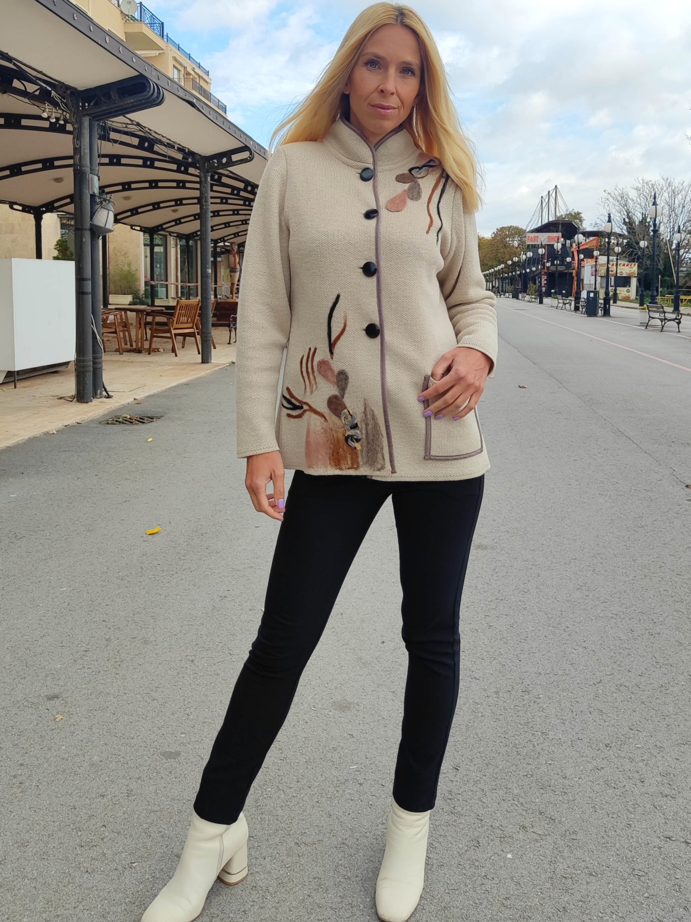 Добави стил и комфорт към визията си с тази елегантна дамска жилетка в бежово с фина бродерия. Класическият ѝ дизайн я прави подходяща както за ежедневието, така и за по-официални поводи. Изработена от мека и приятна на допир материя, тя осигурява топлина и удобство през целия ден.