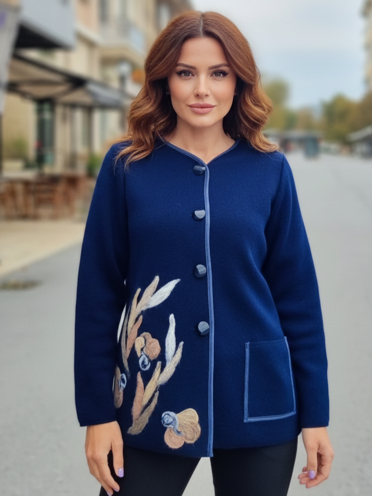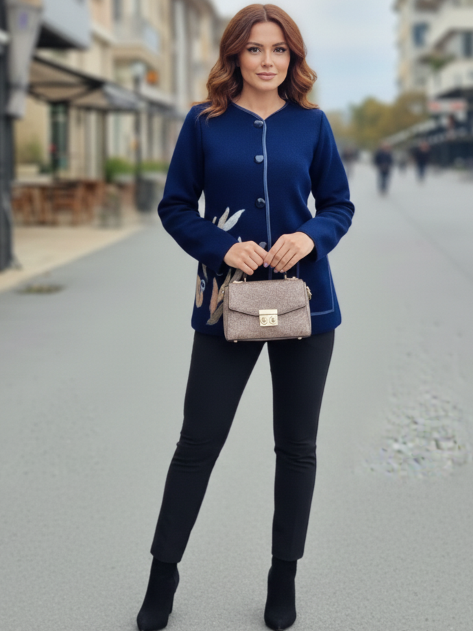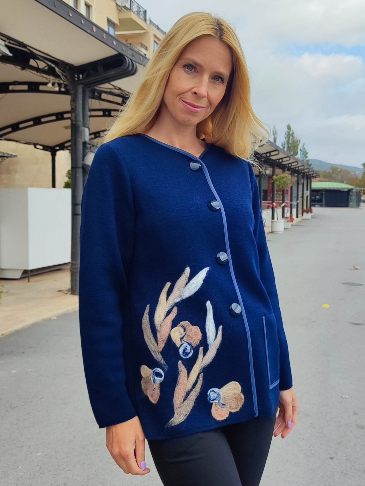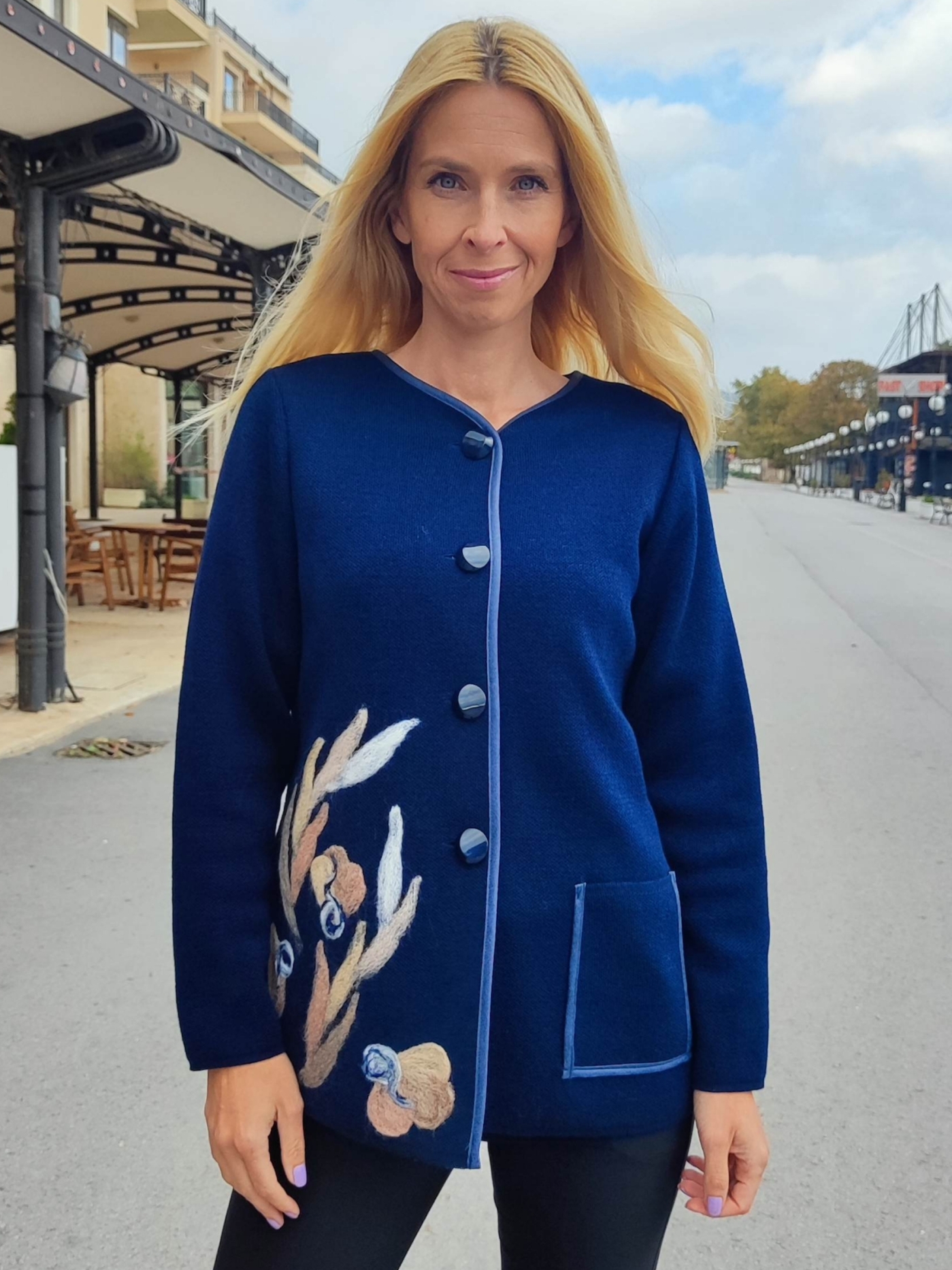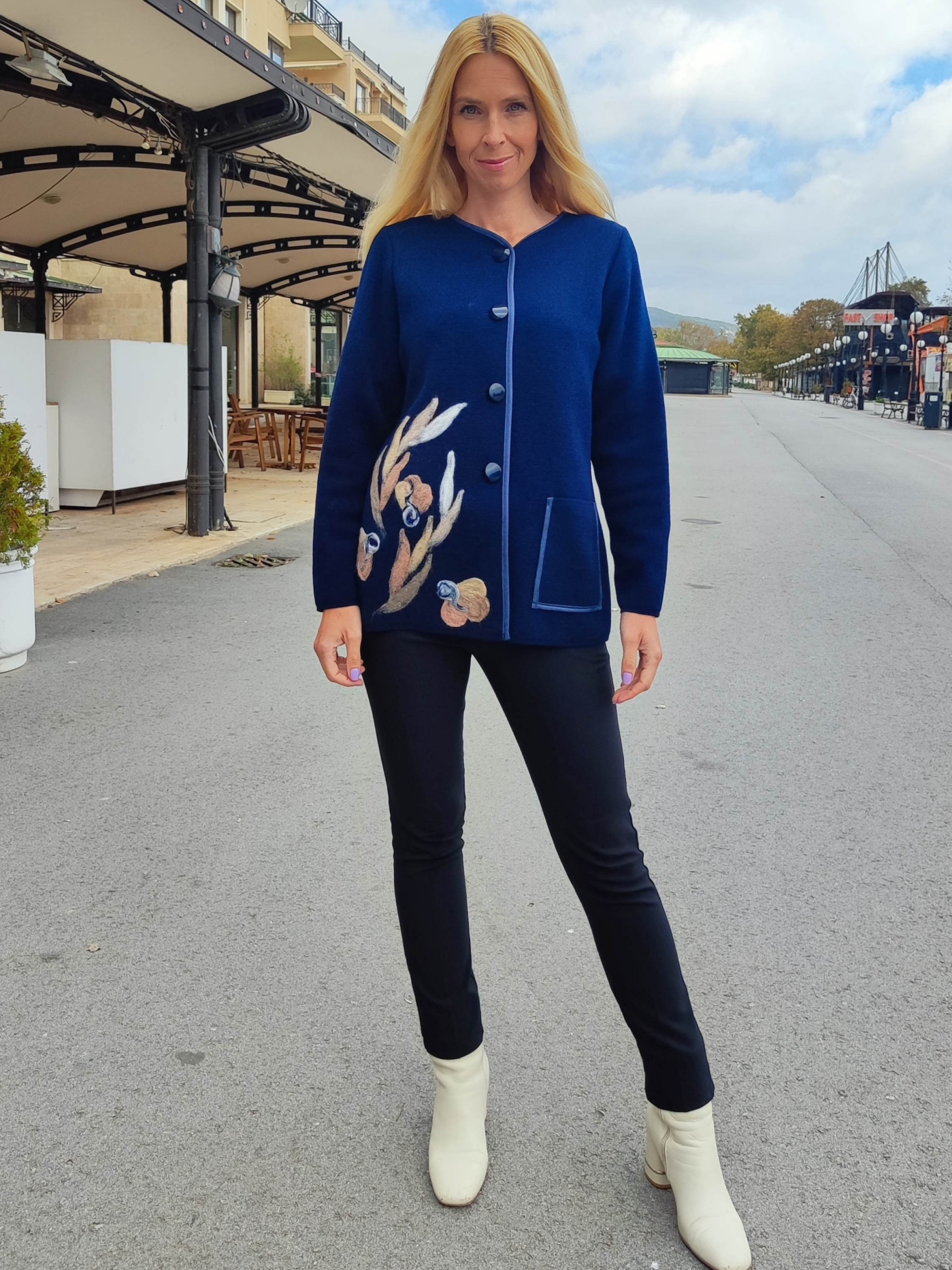 Дамска жилетка в тъмно синьо с артистичен флорален дизайн