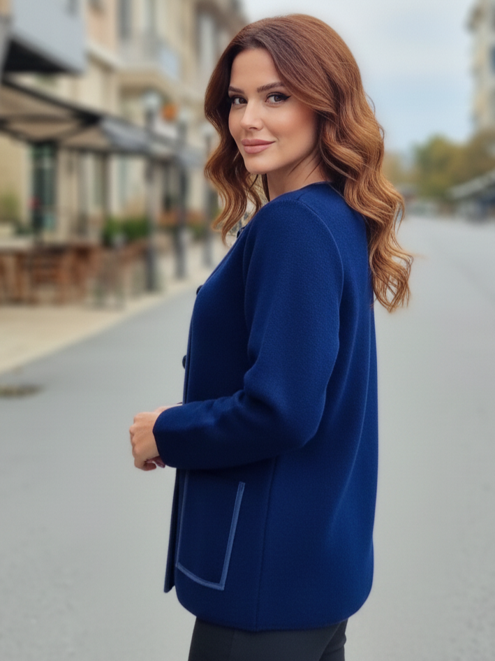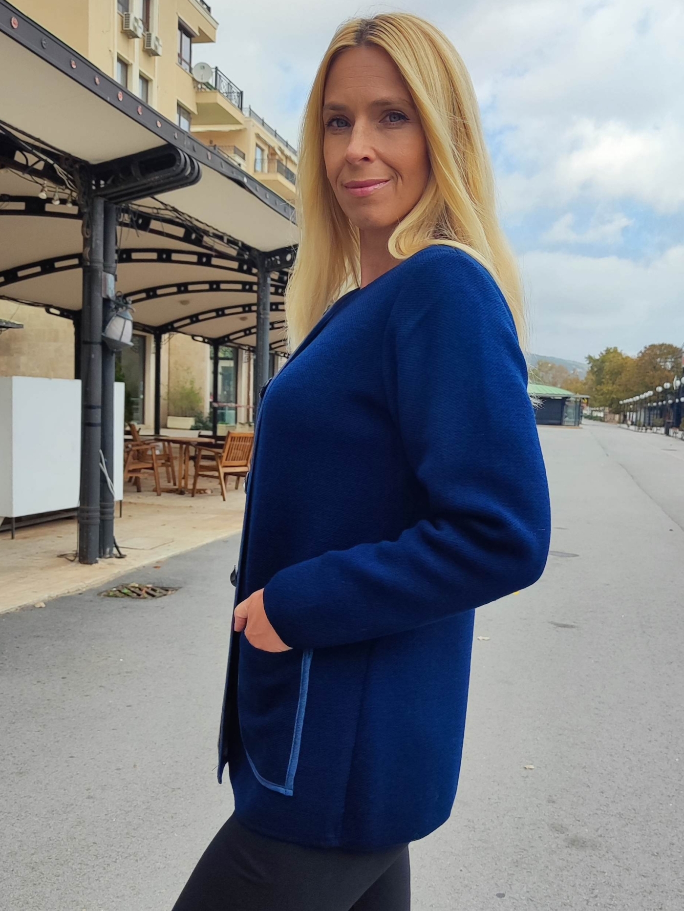 Добави стил и комфорт към визията си с тази елегантна дамска жилетка в тъмно синьо с фина бродерия. Класическият ѝ дизайн я прави подходяща както за ежедневието, така и за по-официални поводи. Изработена от мека и приятна на допир материя, тя осигурява топлина и удобство през целия ден.
