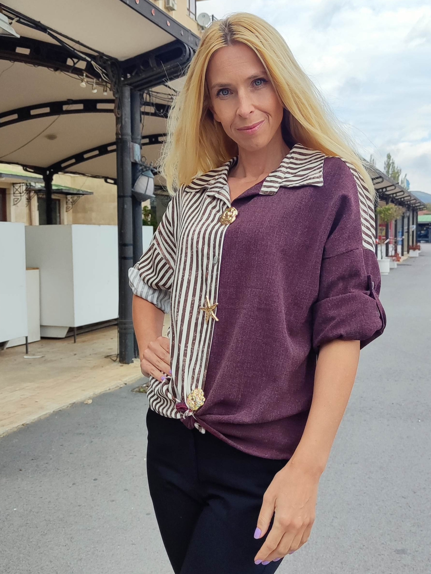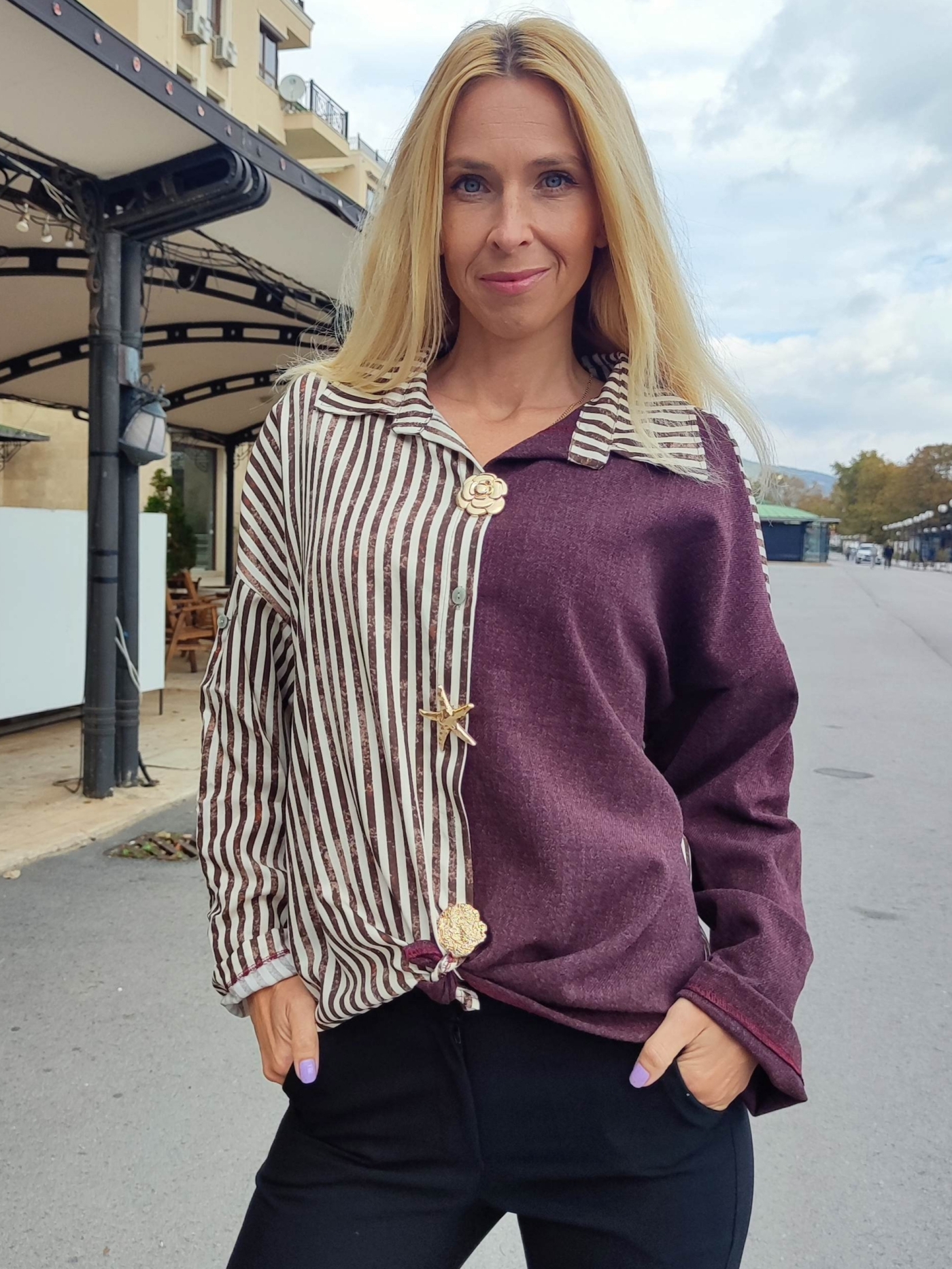 Открий уникалния чар на дамската риза „Бордо и райе“ – перфектната комбинация между елегантен стил и ежедневен комфорт. Моделът впечатлява с креативен дизайн – половината е в цвят бордо, а другата с елегантно кафяво-бяло райе.