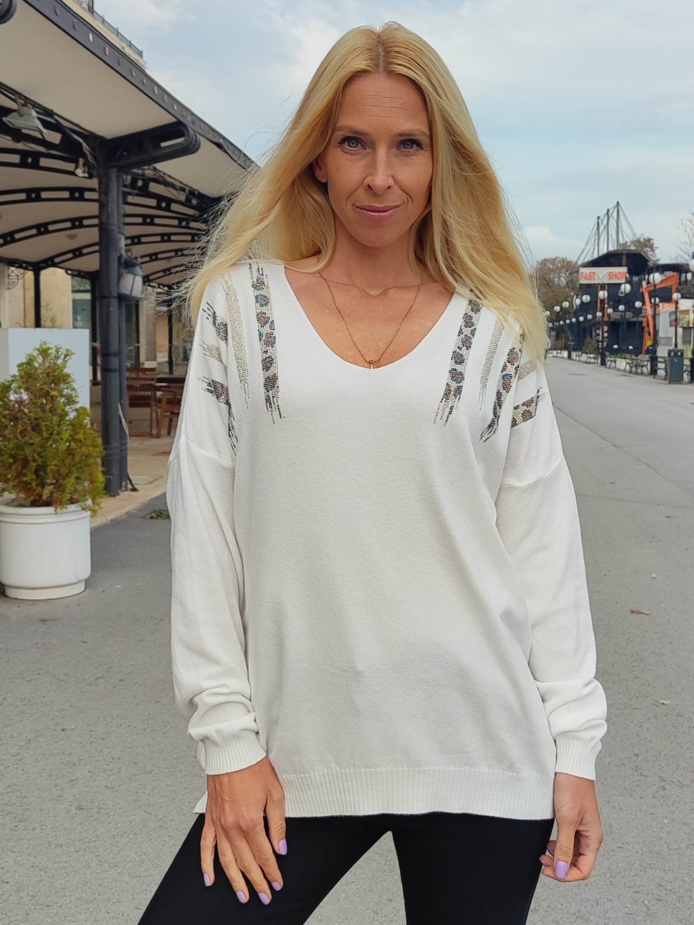 Дамска блуза в бяло с V-образно деколте и декоративни акценти
