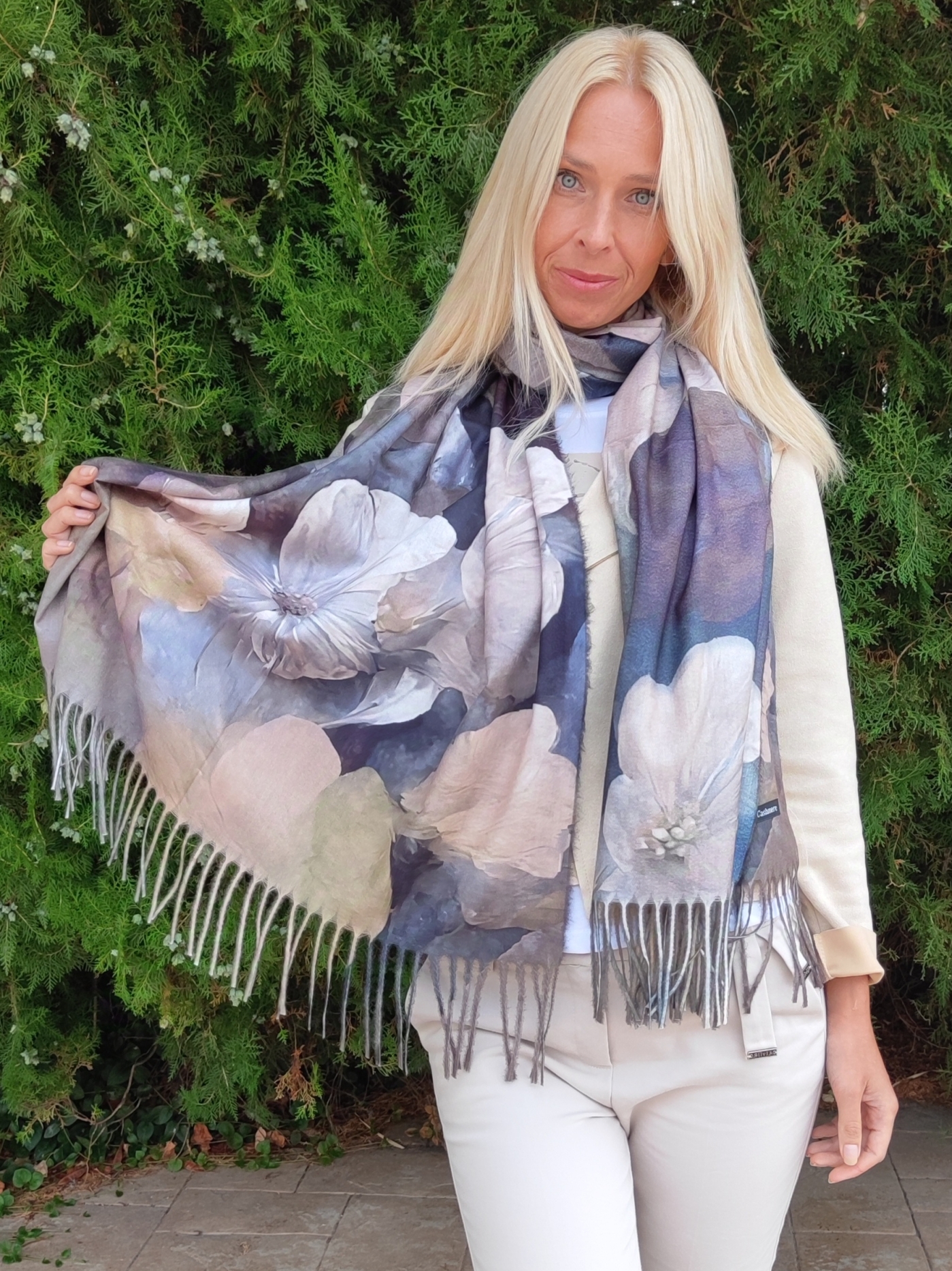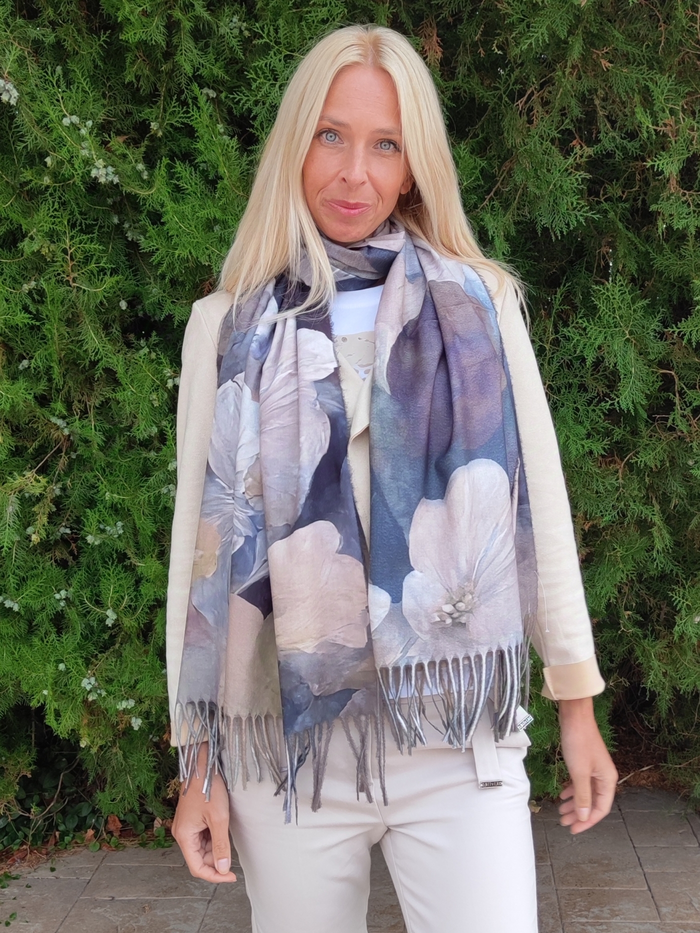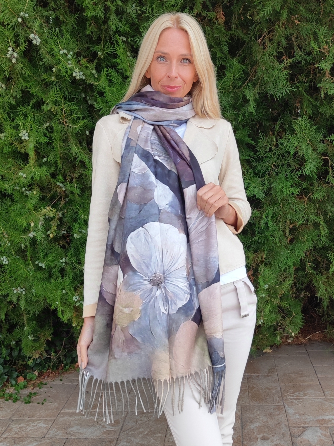 Добавете цвят и изящество към своя стил с този елегантен дамски шал с художествен флорален принт. Мека, лека и приятна на допир, материята пада красиво и позволява шала да бъде носен както в ежедневието, така и като акцент към по-елегантна визия.